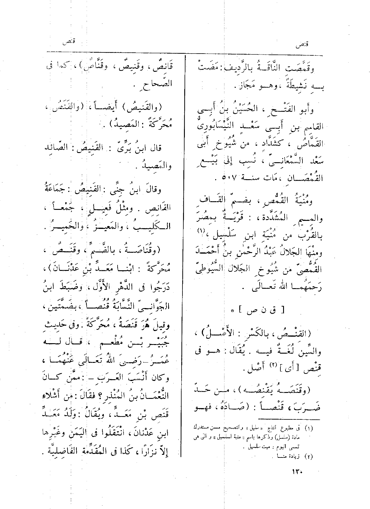 القِنْصُ، بالكَسْرِ: الأَصْلُ، والسِّين لُغَةٌ فِيهِ. يُقَال: هُوَ فِي قِنْص أَي أَصْل. وقَنَصَهُ يَقْنِصُه، من حَدّ ضَرَبَ، قَنْصاً: صَادَهُ، فَهُوَ قَانِصٌ، وقَنِيصٌ، وقَنَّاصٌ، كَمَا فِي الصّحاحِ. والقَنِيصُ أَيضاً، والقَنَصُ، مُحَرَّكَةً: المَصِيدُ. قَالَ ابنُ بَرِّيّ: القَنِيصُ: الصَّائِد والمَصِيدُ. وقالَ ابنُ جِنِّي: القَنِيصُ: جَمَاعَةُ القَانِصِ. ومِثْلُ فَعِيلٍ، جَمْعاً، الكَلِيبُ، والمَعيزُ، والحَمِيرُ. وقُنَاصَةُ، بالضَّمِّ، وقَنَصٌ، مُحَرَّكةً: ابْنا مَعَدِّ بْنِ عَدْنَانَ، دَرَجُوا فِي الدَّهْرِ الأَوَّلِ، وضَبَطَ ابنُ الجَوَّانِيّ النَّسَّابَةُ قُنُصاً، بضَمَّتَين، وقِيلَ هُوَ قَنَصَةُ، مُحَرَّكَةً. وَفِي حَدِيثِ جُبَيْرٍ بْنِ مُطْعِمِ، قَالَ لَهُ عُمَرُ رَضِيَ اللهُ تَعَالَى عَنْهُمَا، وَكَانَ أَنْسَب العَرَبِ: مِمَّن كانَ النُّعْمَانُ بنُ المُنْذِرِ فقَالَ: وَلَدُ مَعَدِّ ابنِ عَدْنانَ، انْتَقَلُوا فِي اليَمَن وغَيْرِها إِلاّ نزَاراً، كَذا فِي المُقَدِّمة الفَاضِلِيَّة.