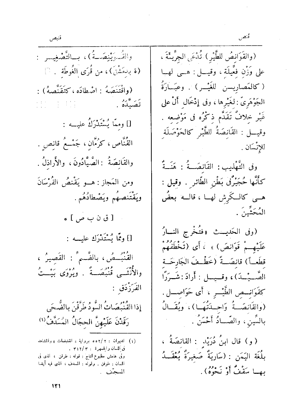 وَفِي التَّهْذِيب: القَانِصَةُ: هَنَةٌ كأَنَّها حُجَيْرٌ فِي بَطْنِ الطّائرِ. وقِيل: هِيَ كالكَرِشِ لَهَا، قَالَه بعضُ المُحَشِّينَ. وَفِي الحَدِيثِ فتُخْرج النارُ عَلَيْهِمْ قَوَانِصَ، أَي تَخْطَفُهُمْ قِطَعاً قانِصَةً خَطْفَ الجَارَحَةِ الصَّيْدَ، وَقيل: أَرادَ: شَرَراً كقَوَانِصِ الطَّيْرِ، أَي حَوَاصِل. والقَانِصَةُ وَاحِدَتُهَا، ويُقَالُ بالسِّينِ، والصّادُ أَحْسَنُ. قَالَ ابنُ دُرَيْدٍ: القانِصَةُ، بلُغَةِ اليَمَنِ: سَارِيَةٌ صَغِيرَةٌ يُعْقَدُ بهَا سَقْفٌ أَو) نَحْوُهُ. والقُوَيْنِصَةُ، بالتَّصْغِير ة بدِمَشْقَ، من قُرَى الغُوطَةِ. واقْتَنَصَهُ: اصْطادَه، كتَقَنَّصهُ: تَصَيَّدَهُ. ومِمَّا يُسْتَدْرَك عَلَيْهِ: القُنَّاص، كرُمَّانٍ، جَمْعُ قانِصٍ. والقَانِصَةُ: الصَّيَّادُونَ، والأَراذِلُ.