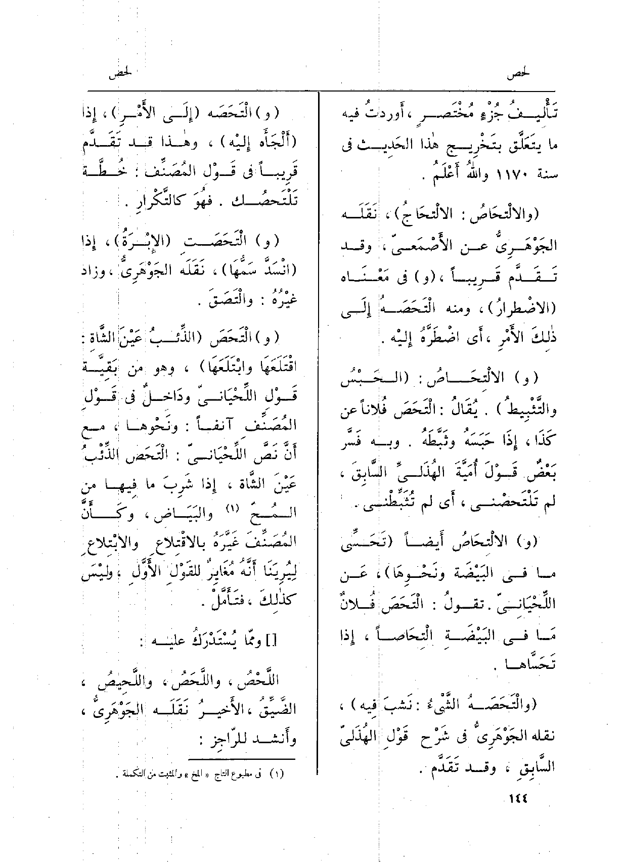 تأْلِيفُ جُزْءٍ مُخْتَصرٍ، أَوردتُ فِيهِ مَا يتَعَلَّق بتَخْرِيج هَذَا الحَدِيث فِي سنة واللهُ أَعْلَمُ. والالْتِحَاصُ: والالْتِحَاجُ، نَقَلَه الجَوْهَرِيُّ عَن الأَصْمَعِيّ، وَقد تَقَدَّم قَرِيباً، فِي مَعْنَاه الاضْطرارُ، وَمِنْه الْتَحَصَهُ إِلَى ذلِكَ الأَمْرِ، أَي اضْطَرَّهُ إِليْه. والالْتِحَاصُ: الحَبْسُ والتَّثْبِيطُ. يُقَالُ: الْتَحَصَ فُلاناً عَن كَذَا، إِذَا حَبَسَهُ وثَبَّطَهُ. وَبِه فَسَّر بَعْضٌ قَوْلَ أُمَيَّةَ الهُذَلِيِّ السَّابِقَ، لم تَلْتَحِصْني، أَي لم تَثَبِّطْنِي. الالْتِحَاصُ أَيضاً تَحَسِّى مَا فِي البَيْضَةِ ونَحْوِهَا، عَن اللِّحْيَانِيّ. تقولُ: الْتَحَصَ فُلانٌ مَا فِي البَيْضَةِ الْتِحَاصاً، إِذا تَحَسَّاها. والْتَحَصَهُ الشَّيْءُ: نَشَبَ فِيه، نَقله الجَوْهَرِيُّ فِي شَرْح قَوْلِ الهُذَلِيّ السَّابِقِ، وَقد تَقَدَّم. الْتَحَصَه إِلَى الأَمْرِ، إِذا أَلْجَأَه إِليْهِ، وَهَذَا قد تَقَدَّم قَرِيباً فِي قَوْلِ المُصَنِّف: خُطَّة تَلْتَحصُك. فهُوَ كالتَّكْرَارِ. الْتَحَصَتِ الإِبْرَةُ، إِذا انْسَدَّ سَمُّهَا، نَقَلَه الجَوْهَرِيُّ، وَزَاد غيْرُهُ: والْتَصَقَ. الْتَحَصَ الذِّئبُ عَيْنَ الشَّاةِ: اقْتَلَعَهَا وابْتَلَعَهَا، وَهُوَ من بَقِيَّة قَوْلِ اللِّحْيَانيّ ودَاخِلٌ فِي قَوْلِ المُصَنِّفِ آنِفا: ونحْوها، مَعَ أَنَّ نَصَّ اللِّحْيَانيّ: الْتَحَص الذِّئْبُ عَيْنَ الشَّاة، إِذا شَرِبَ مَا فِيها من المُحّ والبَيَاضِ، وكَأَنَّ المُصَنِّفَ غَيَّرَهُ بالاقْتِلاعِ والابْتِلاعِ لِيُرِيَنَا أَنَّهُ مُغَايِرُ للقَوْلِ الأَوَّلِ، وليْسَ كذلِكَ، فتَأَمَّلْ. وممّا يُسْتَدْرَكُ عَلَيْهِ: اللَّحْصُ، واللَّحَصُ، واللَّحِيصُ، الضَّيِّقُ، الأَخِيرُ نَقَلَه الجَوْهَرِيُّ، وأَنشد للرّاجِز: