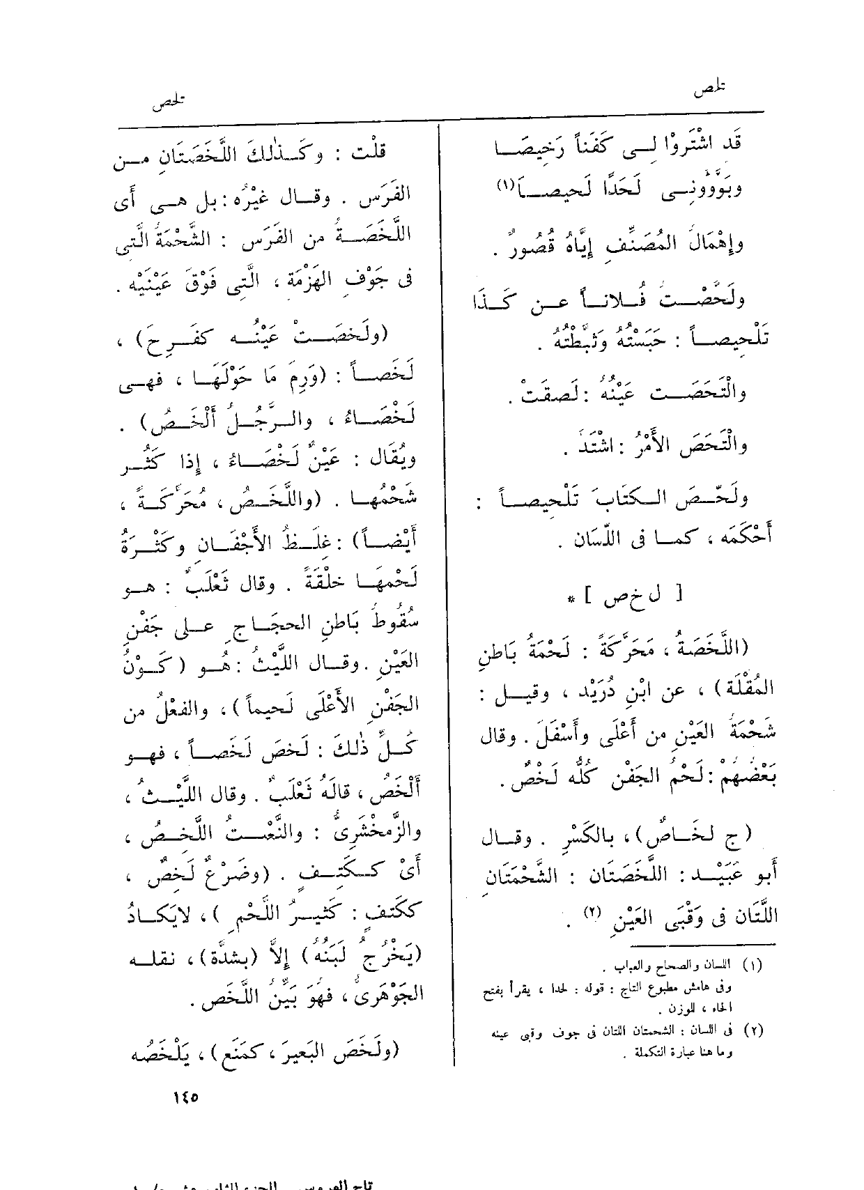 وَقَالَ بَعْضُهُمْ: لَحْمُ الجَفْن كُلُّه لَخْصٌ. ج لخَاصٌ، بالكَسْرِ. وَقَالَ أَبو عُبَيْد: اللَّخَصَتَان: الشَّحْمَتَانِ اللَّتَان فِي وَقْبَى العَيْنِ. قلْت: وكَذلكَ اللَّخْصَتَانِ من الفَرَسِ. وَقَالَ غيْرُه: بل هِيَ أَي اللَّخَصَةُ من الفَرَس: الشَّحْمَةُ الَّتِي فِي جَوْفِ الهَزْمةِ، الَّتِي فَوْقَ عَيْنَيْه. ولَخِصَتْ عَيْنُه كفَرِحَ، لَخَصاً: وَرِحَ مَا حَوْلَهَا، فَهِيَ لَخْصَاءُ، والرَّجُلُ أَلْخَصُ. ويُقَال: عَيْنٌ لَخْصَاءُ، إِذا كَثُر شَحْمُها. واللَّخَصُ، مُحَرَّكَةً، أَيْضاً: غِلَظُ الأَجْفَانِ وكَثْرَةُ لَحْمهَا خلْقَةً. وَقَالَ ثَعْلَبٌ: هُوَ سُقُوطُ بَاطنِ الحِجَاجِ على جَفْنِ العَيْنِ. وَقَالَ اللَّيْثُ: هُو كَوْنُ الجَفْنِ الأَعْلَى لَحيماً، والفعْلُ من كُلِّ ذلكَ: لَخصَ لَخَصاً، فَهُوَ أَلْخَصُ، قالَهُ ثَعْلَبٌ. وَقَالَ اللَّيْثُ، والزَّمخْشَرِيُّ: والنَّعْتُ اللَّخِصُ، أَي ككَتِفٍ. وضَرْعٌ لَخِصٌ، ككَتفٍ: كَثيرُ اللَّحْمِ، لَا يَكادُ يَخْرُجُ لَبَنُهُ إِلاَّ بشدَّة، نَقله الجَوْهَريُّ، فهُوَ بَيِّنُ اللَّخَص. ولَخَصَ البَعيرَ، كمَنَع، يَلْخَصُه