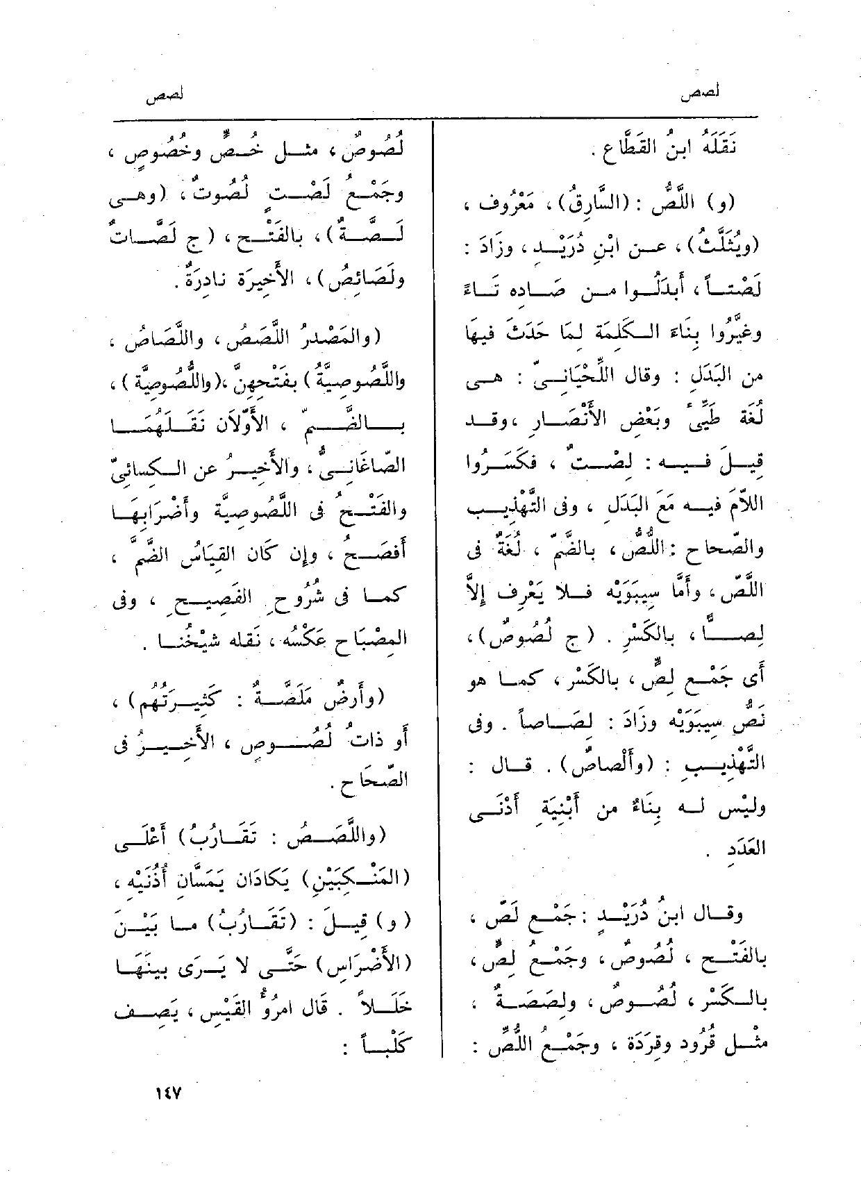 ِ نَقَلَهُ ابنُ القَطَّاع. {اللَّصُّ: السَّارِقُ، مَعْرُوف، ويُثَلَّثُ، عَن ابْنِ دُرَيْدٍ، وزَادَ: لَصْتاً، أَبدَلُوا من صَادِه تَاءً وغيَّرُوا بِنَاءَ الكَلِمَة لِمَا حَدَثَ فيهَا من البَدَلِ: وَقَالَ اللِّحْيَانِيّ: هِيَ لُغَة طَيِّئ وبَعْضِ الأَنْصَارِ، وَقد قِيلَ فِيهِ: لِصْتٌ، فكَسَرُوا اللاّمَ فِيهِ مَعَ البَدَلِ، وَفِي التَّهْذِيب والصّحاح:} اللُّصُّ، بالضَّمّ، لُغَةٌ فِي اللَّصّ، وأَمَّا سِيبَوَيْه فَلَا يَعْرِف إِلاَّ لِصّاً، بالكَسْرِ. ج {لُصُوصٌ، أَي جَمْع لِصٍّ، بالكَسْر، كَمَا هُوَ نَصُّ سِيبَوَيْه وزَادَ:} لِصَاصاً. وَفِي التَّهْذِيبِ: {وأَلْصاصٌ. قَالَ: وليْس لَهُ بِنَاءٌ من أَبْنِيَةِ أَدْنَى العَدَدِ. وَقَالَ ابنُ دُرَيْدٍ: جَمْع} لَصّ، بالفَتْح، {لُصُوصٌ، وجَمْعُ} لِصٍّ، بالكَسْر، {لُصُوصٌ،} ولِصَصَةٌ، مثْل قُرُود وقِرَدَة، وجَمْعُ {اللُّصِّ:} لُصُوصٌ، مثل خُصٍّ وخُصُوصٍ، وجَمْعُ لَصْتٍ لُصُوتٌ، وَهِي {لَصَّةٌ، بالفَتْح، ج} لَصَّاتٌ {ولَصَائِصُ، الأَخِيرَة نادِرَةٌ. والمَصْدرُ} اللَّصَصُ، {واللَّصَاصُ،} واللَّصُوصِيَّةُ بفَتْحِهِنَّ، {واللُّصُوصِيَّة، بالضَّمّ، الأَوّلاَن نَقَلَهُمَا الصّاغَانِيُّ، والأَخِيرُ عَن الكِسَائِيّ والفَتْحُ فِي} اللَّصُوصِيَّة وأَضْرَابِهَا أَفصَحُ، وإِن كَان القِيَاسُ الضَّمَّ، كَمَا فِي شُرُوحِ الفَصِيحِ، وَفِي المِصْبَاح عَكْسُه، نَقله شيْخُنا. وأَرضٌ {مَلَصَّةٌ: كَثِيرَتُهُم، أَو ذاتُ} لُصُوصٍ، الأَخِيرُ فِي الصّحَاح.! واللَّصَصُ: تَقَارُبُ أَعْلَى المَنْكِبَيْنِ يَكادَان يَمَسَّانِ أُذُنَيْهِ، قِيلَ: تَقَارُبُ مَا بَيْنَ الأَضْرَاسِ حَتَّى لَا يَرَى بينَهَا خَلَلاً. قَال امرُؤُ القَيْسِ، يَصِف كَلْباً: