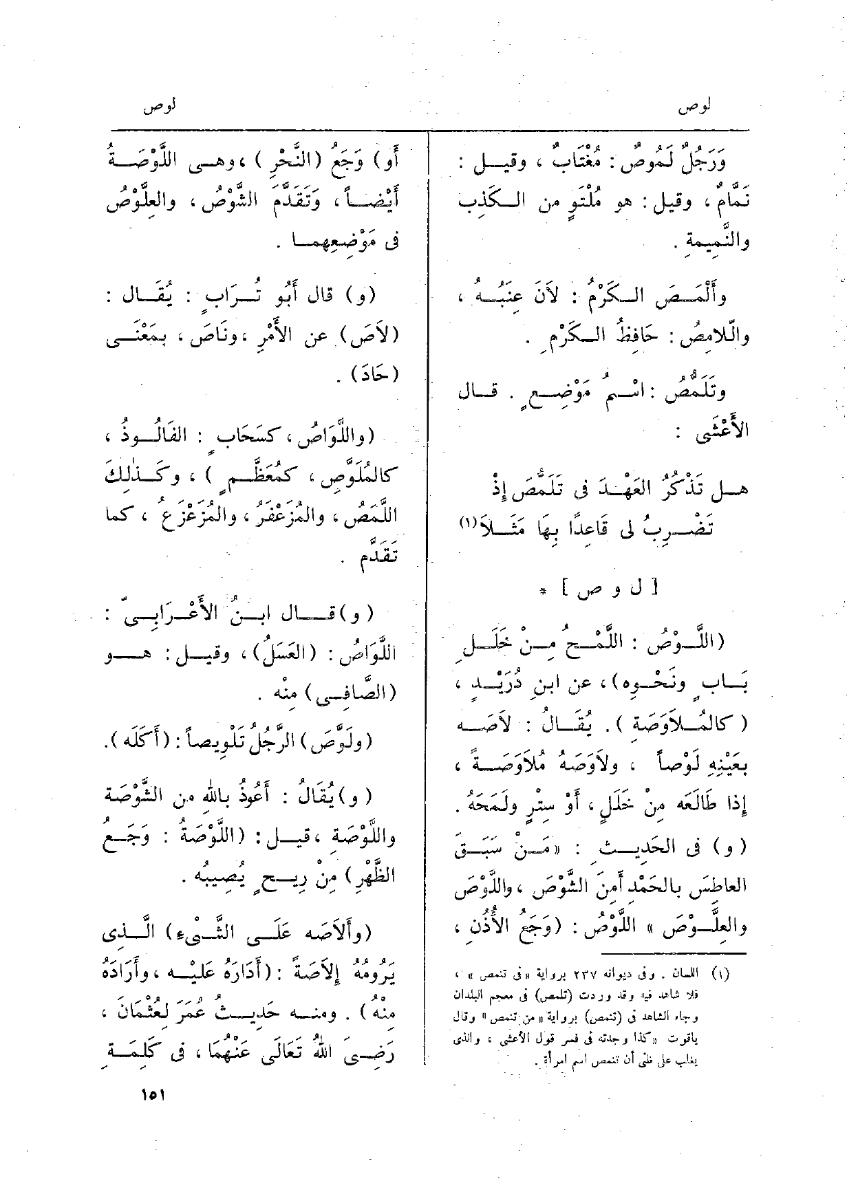 {اللَّوْصُ: اللَّمْحُ مِنْ خَلَلِ بَابٍ ونَحْوِه، عَن ابنِ دُرَيْدٍ،} كالمُلاَوَصَةِ. يُقَالُ: {لاَصَه بعَيْنِهِ} لَوْصاً، {ولاَوَصَهُ} مُلاَوَصَةً، إِذا طَالَعَه مِنْ خَلَلٍ، أَوْ سِتْرٍ ولَمَحَهُ. فِي الحَدِيثِ: مَنْ سَبَقَ العاطِسَ بالحَمْدِ أَمِنَ الشَّوْصَ، {واللَّوْصَ والعِلَّوْصَ اللَّوْصُ: وَجَعُ الأُذُنِ، أَو وَجَعُ النَّحْرِ، وَهِي} اللَّوْصَةُ أَيْضاً، وَتَقَدَّمَ الشَّوْصُ، والعِلَّوْصُ فِي مَوْضِعِهما. قَالَ أَبُو تُرَابٍ: يُقَال: {لاَصَ عَن الأَمْرِ، ونَاصَ، بمَعْنَى حَادَ.} واللَّوَاصُ، كسَحَابٍ: الفَالُوذُ، كالمُلَوَّصِ: كمُعَظَّمٍ، وكَذلِكَ اللَّمَصُ، والمُزَعْفَرُ، والمُزَعْزَعُ، مَا تَقَدَّم. قَالَ ابنُ الأَعْرَابِيّ: {اللَّوَاصُ: العَسَلُ، وَقيل: هُوَ الصَّافِي مِنْه.} ولَوَّصَ الرَّجُلُ تَلْوِيصاً: أَكَلَه. يُقَالُ: أَعُوذُ باللهِ من الشَّوْصَة {واللَّوْصَةِ، قيل: اللَّوْصَةُ: وَجَعُ الظَّهْرِ مِنْ رِيحٍ يُصِيبُه.} وأَلاَصَه عَلَى الشَّيْءِ الَّذِي يَرُومُهُ! إِلاَصَةً: أَدَارَهُ عَليْه، وأَرَادَهُ مِنْهُ. وَمِنْه حَدِيثُ عُمَرَ لِعُثْمَانَ، رَضِيَ اللهُ تَعَالَى عَنْهُمَا، فِي كَلِمَة