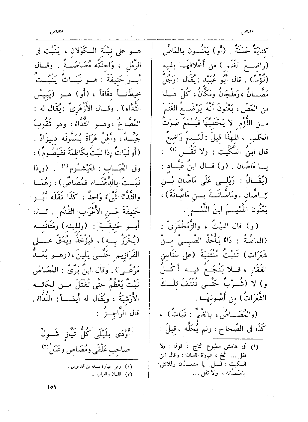 كِنايَةٌ حَسَنَةٌ. أَو يَعْنُون بالمَاصِّ راضِعَ الغَنَمِ من أَخْلافِهَا بفِيهِ لُؤْماً. قَالَ أَبُو عُبَيْد: يُقَال: رَجُلٌ {مَصَّانُ، وملْجانُ ومَكَّانُ، كُلّ هَذَا من المَصّ، يَعْنُونَ أَنَّهُ يَرْضَعُ الغَنَمَ من اللُّؤْمِ لَا يَحْتَلِبُهَا فيُسْمَعَ صَوْتُ الحَلْبِ، فلِهذَا قِيلَ: لَئِيمٌ رَاضِعٌ. قَالَ ابنُ السِّكِّيت: وَلَا تَقُل: يَا مَاصّان. قَالَ ابنُ عَبَّادٍ: يُقَالُ: وَيْلِي عَلَى} مَاصَّانِ بْنِ {ماصَّانِ،} ومَاصَّانَةَ بنِ مَاصَّانَةَ، يَعْنُون اللَّئيمَ ابنَ اللَّئمِ. قَالَ الليْثُ، والزَّمَخْشَرِيّ: الماصَّةُ: دَاءٌ يَأْخُذُ الصَّبِيَّ مِنْ شَعَرَات تَنبُتُ مُنْثَنِيَةً على سَنَاسِنِ الفَقَارِ، فَلَا يَنْجَعُ فِيهِ أَكْلٌ وَلَا شُرْبٌ حَتَّى تُنْتَفَ تِلْكَ الشَّعَرَاتُ مِن أُصُولِهَا. {والمُصَاصُ، بالضَّمِّ: نَبَاتٌ، كَذَا فِي الصّحاح، وَلم يُحَلِّه، قِيلَ: هُوَ على نِبْتَةِ الكَوْلانِ، يُنْبُت فِي الرَّمْلِ، وَاحِدَتُه} مُصَاصَةٌ. وَقَالَ أَبو حَنِيفَةَ: هُوَ نَبَاتٌ يَنْبُتُ خِيطَاناً دِقَاقاً، أَو هُوَ يَبِيسُ الثُّدَّاءِ. وَقَالَ الأَزْهَرِيّ: يُقَال لَهُ: المُصَّاخُ، وَهُوَ الثُّدَّاءُ، وَهُوَ يُقُوبٌ جَيِّدٌ، وأَهْلُ هَرَاةَ يُسَمُّونَه دِلِيزَادْ. أَو نَبَاتٌ إِذا نبَتَ بكَاظِمَةَ فقَيْصُومٌ، وَفِي العُبَابِ: فعَيْشُوم. وإِذا نَبَتَ بالدَّهْنَاءِ {فمُصَاصٌ، وهُمَا والثُّدَّاءُ شَيْءٌ وَاحِدٌ، كَذَا نَقَلَه أَبُو حَنِيفَةَ عَنِ الأَعْرَابِ القُدُمِ. قَالَ أَبو حَنِيفَة: ولِلِينهِ ومَتَانَتِه يُخْرَزُ بِهِ، فيُؤْخَذُ ويُدَقّ على الفَرَازِيمِ حَتَّى يَلِينَ، وَهُوَ يُعَدُّ مَرْعىً.