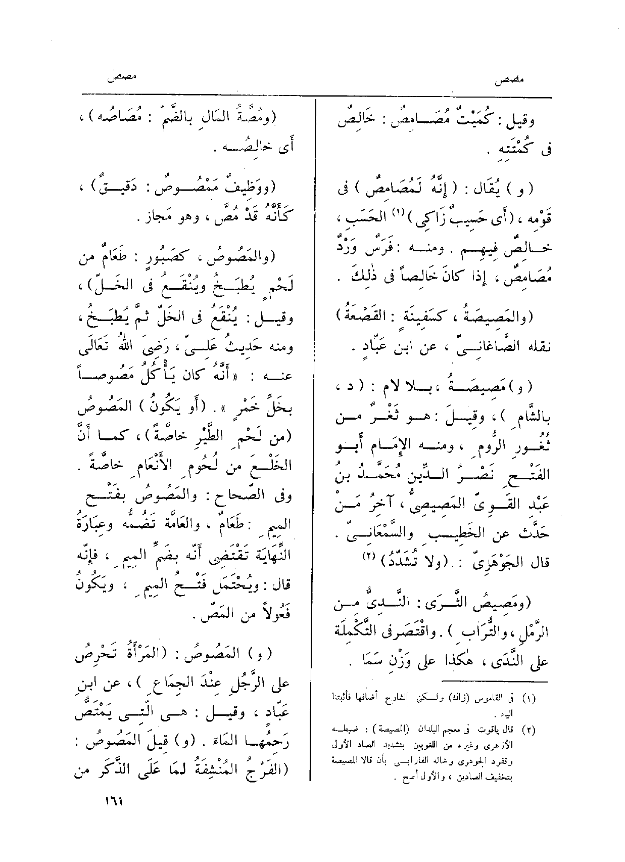 وَقيل: كُمَيْتٌ {مُصَامِصٌ: خَالِصٌ فِي كُمْتَتِهِ. يُقَال: إِنَّهُ} لَمُصَامِصٌ فِي قَوْمِه، أَي حَسِيبٌ زَاكِي الحَسَبِ، خالِصٌ فِيهِم. وَمِنْه: فَرَسٌ وَرْدٌ {مُصَامِصٌ، إِذا كَانَ خَالِصاً فِي ذلِكَ.} والمَصِيصَةُ، كسَفِينَةٍ: القَصْعَةُ نَقله الصَّاغَانِيّ، عَن ابْن عَبّادٍ. و {مَصِيصَةُ، بِلَا لَام: د، بالشَّامِ، وقِيلَ: هُوَ ثَغْرٌ من ثُغُورِ الرُّومِ، وَمِنْه الإِمَام أَبو الفَتْحِ نَصْرُ الدِّين مُحَمَّدُ بنُ عَبْدِ القَوِيّ} - المَصِيصِيُّ، آخِرُ مَنْ حَدَّث عَن الخَطِيبِ والسَّمْعَانِيّ. قَالَ الجَوْهَرِيّ: وَلَا تَشَدّدُ {ومَصِيصُ الثَّرَى: النَّدِيُّ من الرَّمْلِ، والتُّرَابِ. واقْتَصَر فِي التَّكْمِلَة على النَّدَى، هَكَذَا على وَزْنِ سَمَا.} ومُصَّةُ المَالِ بالضَّمّ:) مُصَاصُه، أَي خالِصُه. ووَظِيفٌ {مَمْصُوصٌ: دَقيقٌ، كَأَنَّهُ قَدْ} مُصَّ، وَهُوَ مَجاز. {والمَصُوصُ، كصَبُورٍ: طَعَامٌ من لَحْمٍ يُطبَخُ ويُنْقَعُ فِي الخَلّ، وَقيل: يُنْقَعُ فِي الخَلّ ثمَّ يُطبَخُ، وَمِنْه حَدِيثُ عَلِيّ، رَضِيَ اللهُ تَعَالَى عَنهُ: أَنَّهُ كَانَ يَأْكُلُ} مَصُوصاً بخَلِّ خَمْرٍ. أَو يَكُونُ {المَصُوصُ من لَحْمِ الطَّيْرِ خاصَّةً، كَمَا أَنَّ الخَلْعَ من لُحُومِ الأَنْعَامِ خاصَّةً. وَفِي الصّحاح:} والمَصُوصُ بفَتْح المِيمِ: طَعَامٌ، والعامَّة تَضُمُّه وعِبَارَةُ النِّهَايَة تَقْتَضِي أَنّه بضَمِّ المِيمِ، فإِنّه قَالَ: ويُحْتَمَل فَتْحُ المِيمِ، ويَكُونُ فَعُولاً من المَصّ.! المَصُوصُ: المَرْأَةُ تَحْرِصُ على الرَّجُلِ عِنْدَ الجِمَاعِ، عَن ابنِ عَبّادٍ، وَقيل: هِيَ الّتِي يَمْتَصُّ رَحِمُها المَاءَ. قِيلَ المَصُوصُ: الفَرْجُ المُنْشِفَةُ لمَا عَلَى الذَّكَر من