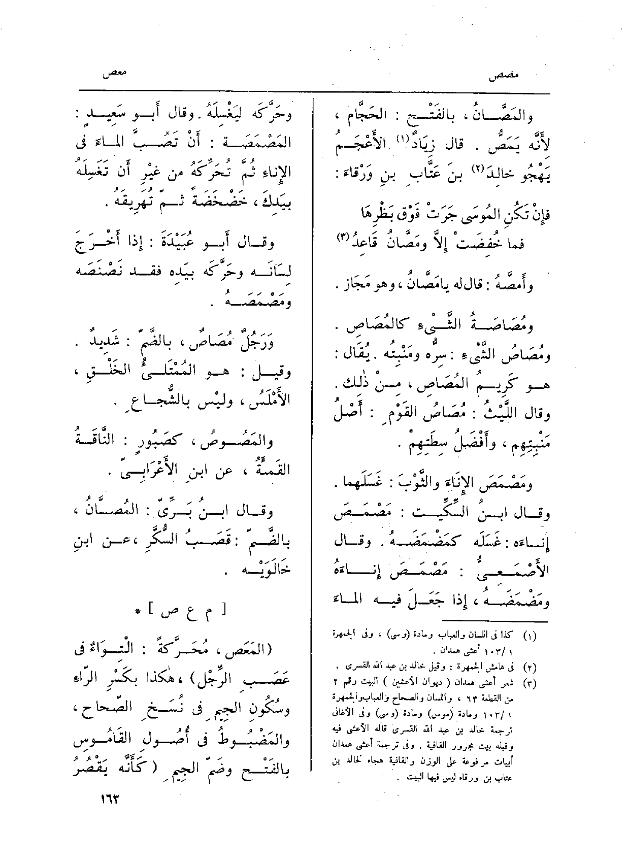 وَقَالَ أَبو سَعِيدٍ: {المَصْمَصَة: أَنْ تَصُبَّ الماءَ فِي الإِناءِ ثُمَّ تُحَرِّكَهُ من غيْرِ أَن تَغَسِلَهُ بيَدِكَ، خَضْخَضَةً ثمّ تُهَرِيقَهُ. وَقَالَ أَبو عُبَيْدَةَ: إِذا أَخْرَجَ لِسَانَه وحَرَّكَه بيَدِه فقد نَصْنَصَه} ومَصْمَصَهُ. وَرَجُلٌ {مُصَاصٌ، بالضَّمّ: شَدِيدٌ. وَقيل: هُوَ المُمْتَلئُ الخَلْقِ، الأَمْلَسُ، وليْس بالشُّجاعِ.