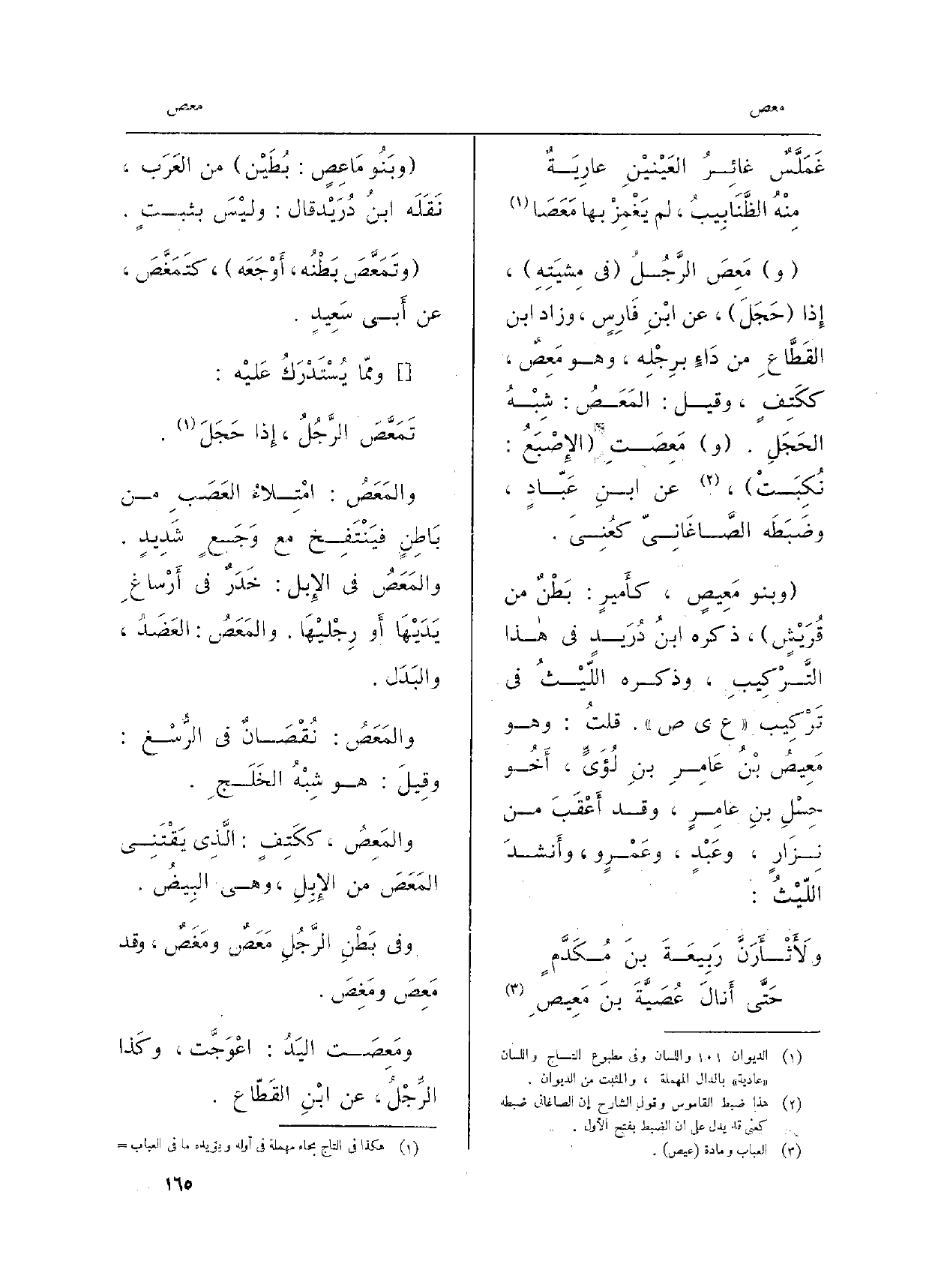مَعِصَ الرَّجُلُ فِي مِشيَتِهِ، إِذا حَجَلَ، عَن ابْنِ فَارِسٍ، وَزَاد ابْن القَطَّاعِ من دَاءٍ برِجْلِه، وَهُوَ مَعِصٌ، ككَتِفٍ، وَقيل: المَعَصُ: شِبْهُ الحَجَلِ. مَعِصَتِ الإِصْبَعُ: نُكِبَتْ، عَن ابنِ عَبّادٍ، وضَبَطَه الصَّاغَانِيّ كعُنِيَ. وَبَنُو مُعِيصٍ، كأَميرٍ: بَطْنٌ من قُرَيْشٍ، ذكره ابنُ دُرَيْدٍ فِي هَذَا التّرْكِيبِ، وَذكره اللّيْثُ فِي تَرْكِيب ع ي ص. قلتُ: وَهُوَ مَعِيصُ بْنُ عَامِرِ بنِ لُؤَيٍّ، أَخُو حِسْلٍ بنِ عَامِرٍ، وَقد أَعْقَبَ من نِزَارٍ، وعَبْدٍ، وعَمْرٍ و، وأَنشدَ اللّيْثُ: