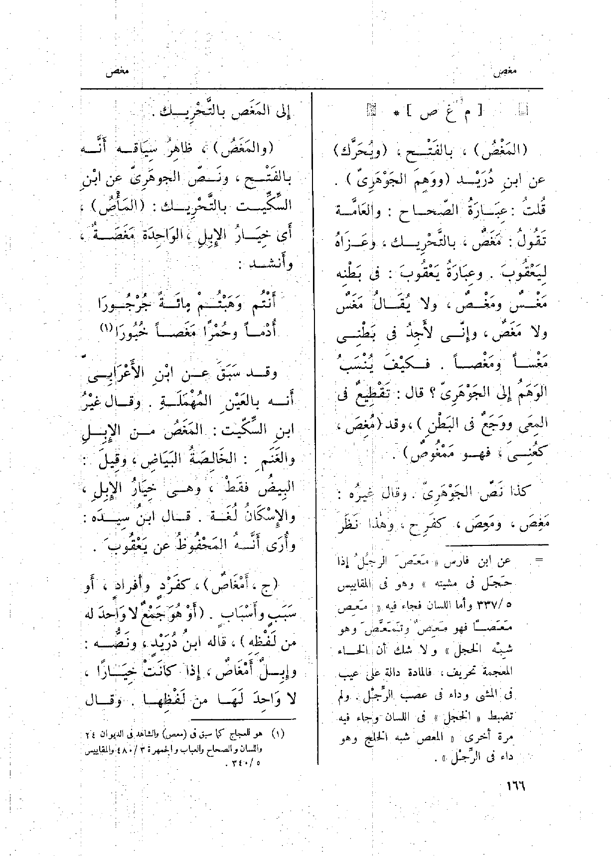 وَقَالَ غيرُه: مَغِصَ، ومَعِصَ، كفَرِح، وَهَذَا نَظَر إِلى المَغَص بالتَّحْرِيك. والمَغَصُ، ظاهِرُ سِيَاقه أَنّه بالفَتْح، ونَصّ الجوهَرِيّ عَن ابْنِ السِّكِّيت بالتَّحْرِيك: المَأْصُ، أَي خِيَارُ الإِبِلِ، الوَاحِدَة مَغَصَةٌ وأَنشد. أَنْتُم وَهَبْتُمْ مائَةً جُرْجُورَا أُدْماً وحُمْراً مَغَصاً خُبُورَا وَقد سَبَقَ عَن ابْنِ الأَعْرَابِيّ أَنه بالعَيْنِ المُهْمَلَةِ. وَقَالَ غَيْرُ ابنِ السِّكّيت: المَغَصُ من الإِبِلِ والغَنَمِ: الخَالِصَةُ البَيَاضٍ، وقِيلَ: البِيضُ فقَطْ، وَهِي خِيَارُ الإِبِلِ، والإِسْكَانُ لُغَة. قَالَ ابنُ سِيدَه: وأُرَى أَنَّهُ المَحْفُوظُ عَن يعْقُوبَ. ج، أَمْغَاصٌ، كفَرْدٍ وأَرادٍ، أَو سَبَبٍ وأَسْبَابٍ. أَوْ هُوَ جَمْعٌ لَا وَاحدَ لَهُ من لَفْظِهِ، قَالَه ابنُ دُرَيْدٍ، ونَصُّه: وإِبِلٌ أَمْغَاصٌ، إِذا كانَتْ خِيَاراً، لَا وَاحِدَ لَهَا من لَفْظِها. وَقَالَ