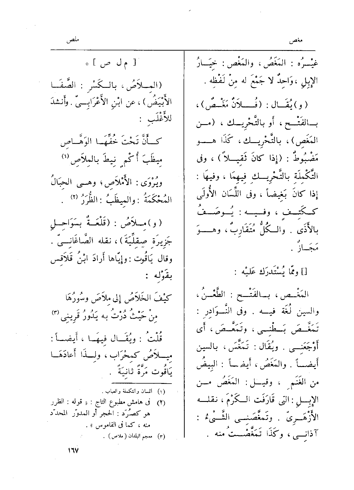 المِلاَصث، بالكَسْرِ: الصَّفَا الأَبْيَضُ، عَن ابْنِ الأَعْرَابِيّ. وأَنشدَ للأَغْلَبِ: كأَنَّ تَحْتَ خُفِّهَا الوّهَّاصِ مِيظَبَ أُكْمٍ نِيطَ بالمِلاَصِ ويُرْوَى: الأَمْلاَصِ وَهِي الحِبَالُ المُحْكَمَةُ: والمِيظَبُ: الظُّرَرُ. مِلاَصُ: قَلْعَةٌ بسَوَاحِلِ جَزِيرَةِ صقلِّيَةَ، نَقله الصَّاغَانِيّ. وَقَالَ يَاقُوت: وإِيّاها أَرادَ ابْنُ قَلاَقِس بقَوْلِه: