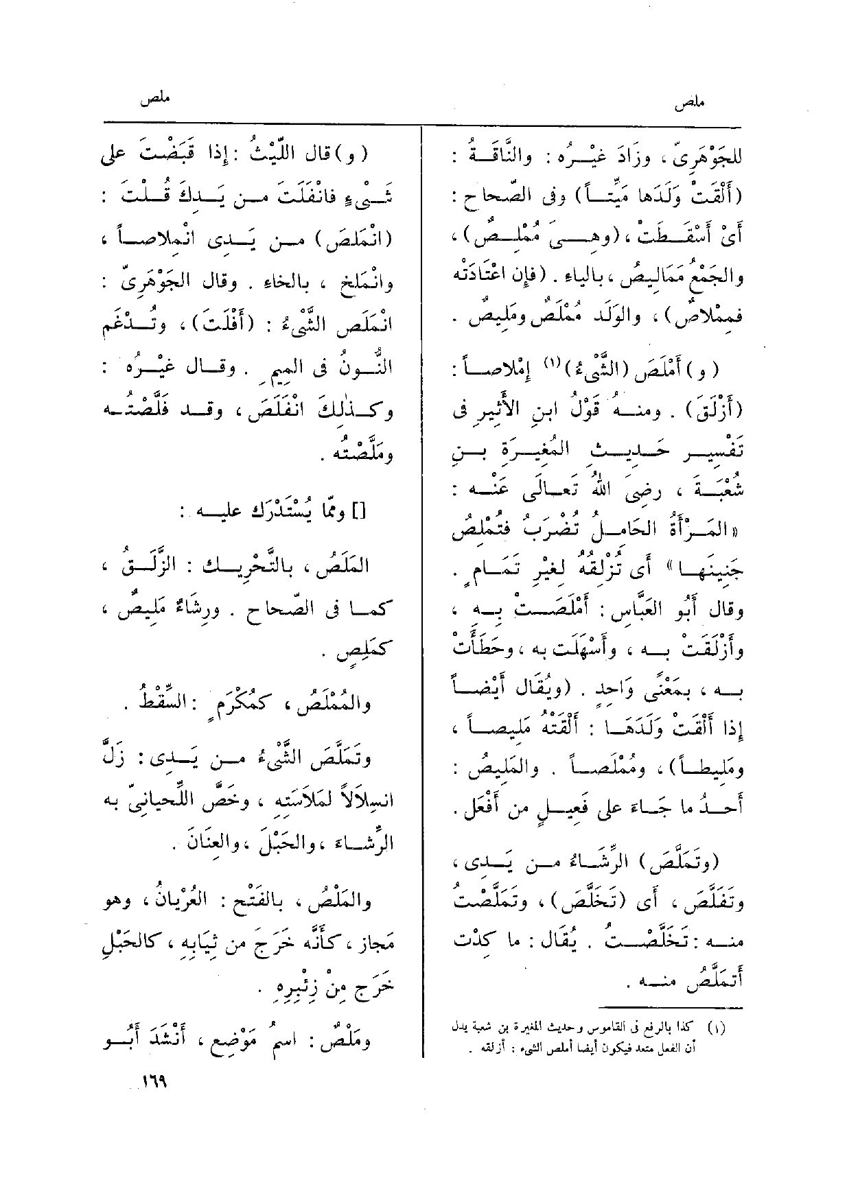 والجَمْعُ مَمَالِيصُ، بالياءِ. فإِن اعْتَادَتْه فمِمْلاصٌ، والوَلَد مُمْلَصٌ ومَلِيصٌ. أَمْلَصَ الشَّيْءُ إِمْلاصاً: أَزْلَقَ. ومنهُ قَوْلُ ابنِ الأَثِيرِ فِي تَفْسِير حَدِيثِ المُغِيرَةِ بنِ شُعْبَةَ، رضِيَ اللهُ تَعالَى عَنْه: المَرْأَةُ الحَامِلُ تُضْرَبُ فتُمْلِصُ جَنِينَها أَي تَزْلِقُهُ لِغيْرِ تَمَامٍ. وَقَالَ أَبو العَبَّاسِ: أَمْلَصَتْ بِهِ وأَزْلَقَتْ بِهِ، وأَسْهَلَت بِهِ، وحَطَأَتْ بِهِ، بمَعْنَىً وَاحِدٍ. ويُقَال أَيْضاً إِذا أَلْقَتْ وَلَدَهَا: أَلْقَتْهُ مَلِيصاً، ومَلِيطاً، ومُمْلَصاً. والمَلِيصُ: أَحدُ مَا جَاءَ على فَعِيلٍ من أَفْعَل. وتَمَلَّصَ الرِّشَاءُ من يَدِي، وتَفَلَّصَ، أَي تَخَلَّصَ، وتَمَلَّصْتُ مِنْهُ: تَخَلَّصْتُ. يُقَال: مَا كِدْت أَتمَلَّصُ مِنْهُ. قَالَ اللّيْثُ: إِذا قَبَضْتَ على شَيْءٍ فانْفَلَتَ من يَدِكَ قُلْتَ: انْمَلَصَ من يَدِي انْمِلاصاً، وانْمَلخ، بالخاءِ. وَقَالَ الجَوْهَرِيّ: انْمَلَص الشَّيْءُ: أَفْلَتَ، وتُدْغَم النُّونُ فِي المِيمِ. وَقَالَ غيْرُه: وكذلِكَ انْفَلَصَ، وَقد فَلَّصْتُه ومَلَّصْتُه. وممّا يُسْتَدْرَك عَلَيْهِ: المَلَصُ، بالتَّحْرِيك: الزَّلَقُ كَمَا فِي الصّحاح. ورِشَاءٌ مَلِيصٌ، كمَلِصٍ: والمُمْلَصُ، كمُكْرَمٍ: السِّقْطُ. وتَمَلَّصَ الشَّيْءُ من يَدِي: زَلَّ انسِلاَلاً لمَلاَسَتِهِ، وخَصَّ اللِّحيانِيّ بِهِ الرِّشَاءَ، والحَبْلُ، والعِنَانَ. والمَلْصُ، بالفَتْح: العُرْيَانُ، وَهُوَ مَجاز، كأَنَّه خَرَجَ من ثِيَابِهِ، كالحَبْلِ خَرَج مِنْ زِئبِرِهِ. ومَلْصٌ: اسمُ مَوْضِع، أَنْشَدَ أَبُو