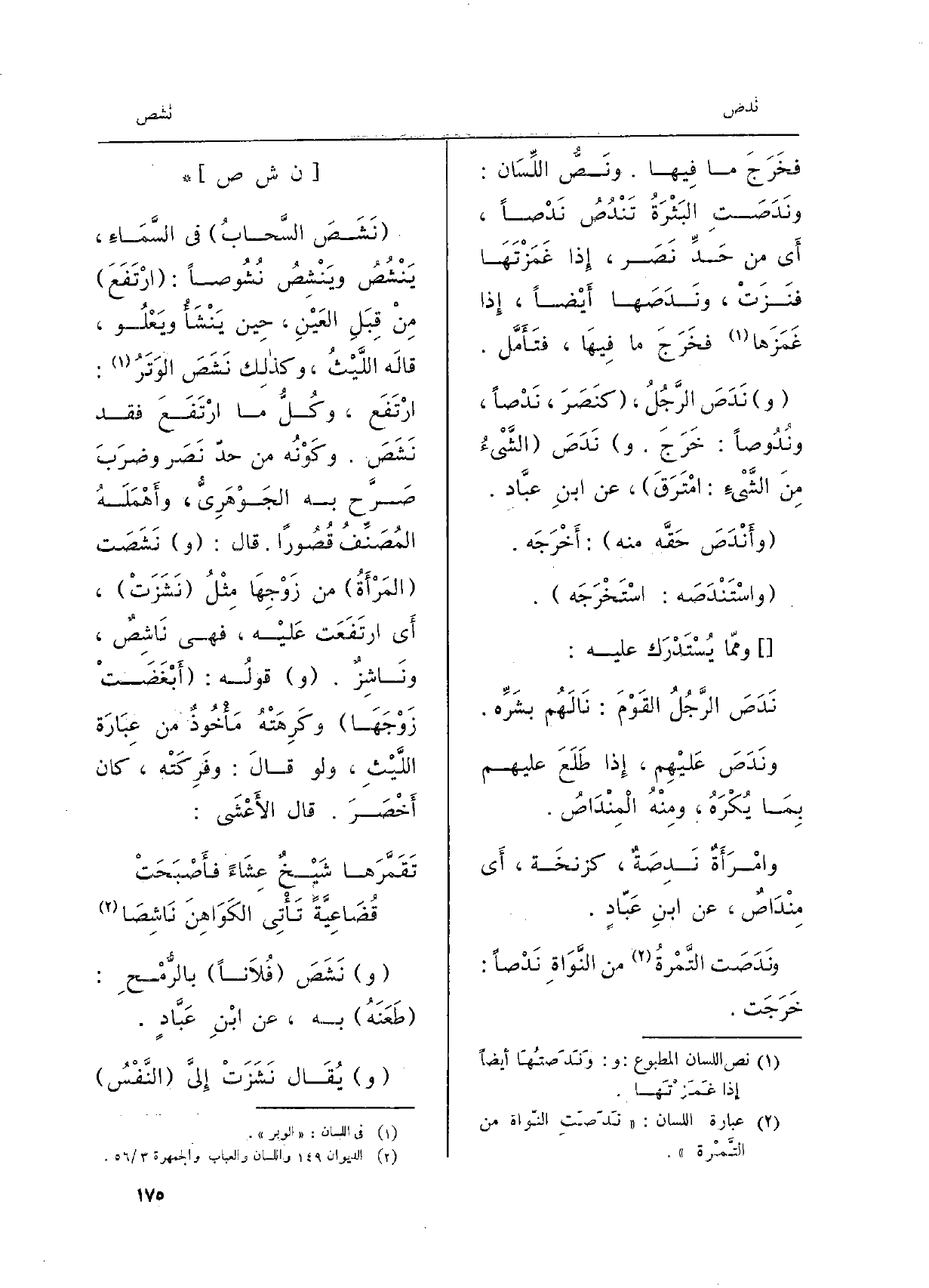 نَشَصَ السَّحابُ فِي السَّمَاءِ، يَنْشُصُ ويَنْشصُ نُشُوصاً: ارْتَفَعَ مِنْ قِبَلِ العَيْنِ، حِين يَنْشَأُ ويَعْلُو، قالَه اللَّيْثُ، وكذلِك نَشَصَ الوَتَرُ: ارْتَفَع، وكُلُّ مَا ارْتَفَعَ فقد نَشَصَ. وكَوْنُه من حدّ نَصَر وضرَبَ صَرَّح بِهِ الجَوْهَرِيُّ، وأَهْمَلَهُ المُصَنِّفُ قُصُوراً. قَالَ: نَشَصَت المَرْأَةُ من زَوْجِهَا مِثْلُ نَشَزَتْ، أَي ارتَفَعَت عَليْه، فَهِيَ نَاشِصٌ، وناشِزٌ. قولُه: أَبْغَضَتْ زَوْجَهَا وَلَو قالَ: وفَرْكَتْه، كَانَ أَخْصَرَ. قَالَ الأَعْشَى: