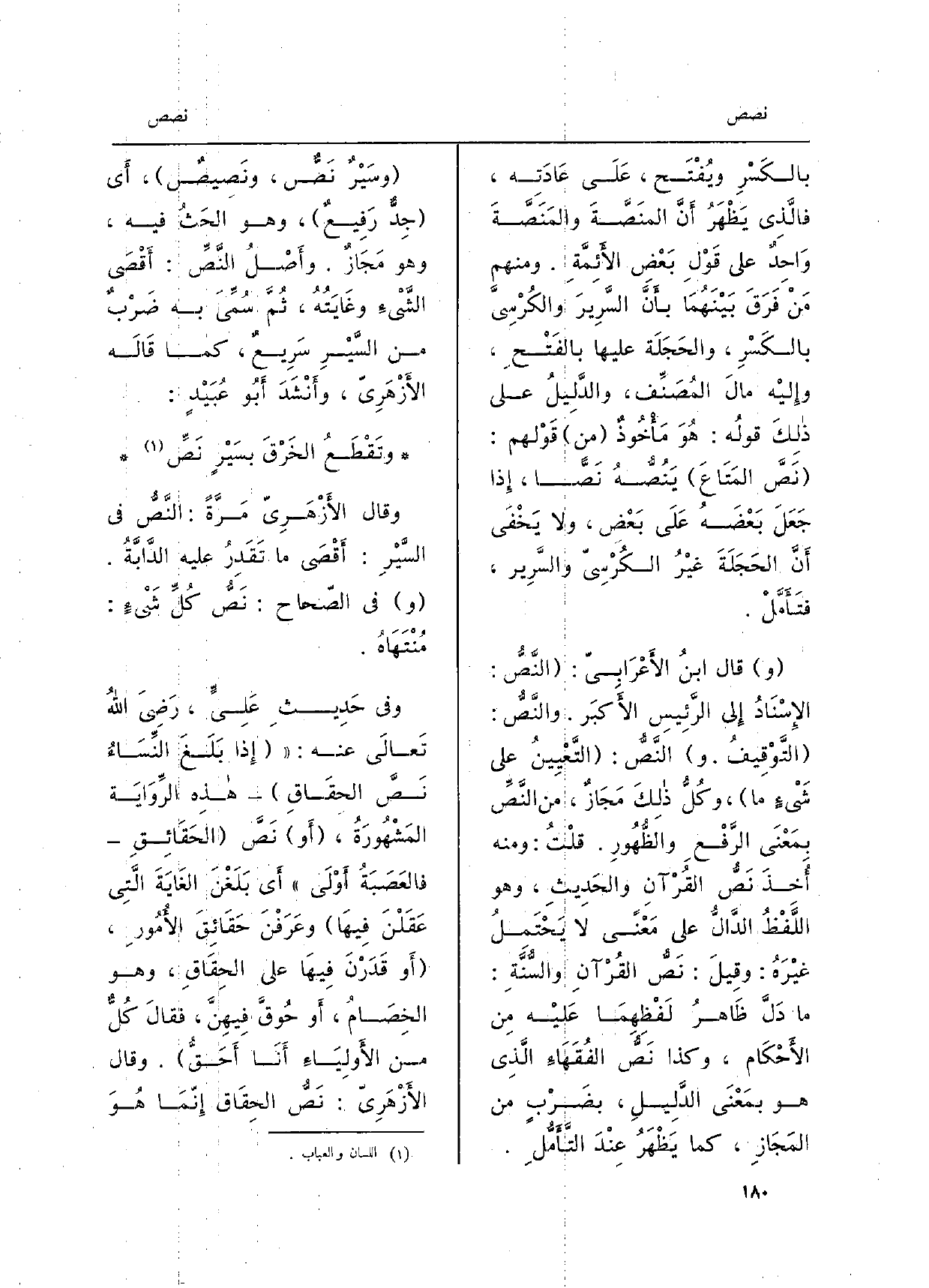 وأَصْلُ {النَّصِّ: أَقْصَى الشَّيْءِ وغَايَتُهُ، ثُمَّ سُمِّيَ بِهِ ضَرْبٌ من السَّيْرِ سَرِيعٌ، كَمَا قَالَه الأَزْهَرِيّ، وأَنْشَدَ أَبُو عُبَيْدٍ: وتَقْطَعُ الخَرْقَ بسَيْرٍ} نَصِّ وَقَالَ الأَزْهَرِيّ مَرَّةً: {النَّصُّ فِي السَّيْرِ: أَقْصَى مَا تَقَدِرُ عَلَيْهِ الدَّابَّةُ. فِي الصّحاح:} نَصُّ كُلِّ شَيْءٍ: مُنْتَهَاهُ. وَفِي حَدِيثِ عَلِيٍّ، رَضِيَ اللهُ تَعَالَى عَنهُ: إِذا بَلَغَ النِّسَاءُ! نَصَّ الحِقَاقِ هذِه الرِّوَايَة المَشْهُورَةُ، أَو نَصَّ الحَقَائِقِ فالعَصَبَةُ أَوْلَى أَي بَلَغْنَ الغَايَةَ الَّتِي عَقَلْنَ فِيهَا وعَرَفْنَ حَقَائِقَ الأُمُورِ، أَو قَدَرْنَ فِيهَا على الحِقَاقِ، وَهُوَ الخِصَامُ، أَو حُوقَّ فِيهِنَّ، فقالَ كُلٌّ من الأَوْلِيَاءِ أَنَا أَحَقُّ. وَقَالَ الأَزْهَرِيّ: نَصُّ الحِقَاق إِنّمَا هُوَ