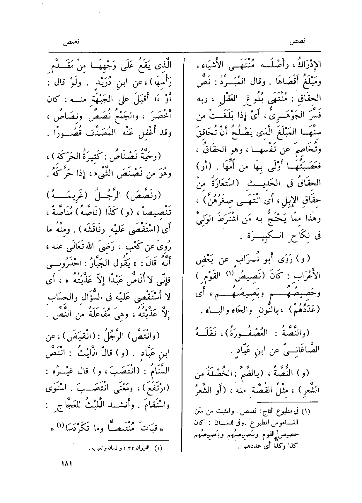 ولَو قَالَ: أَو مَا أَقبَلَ على الجَبْهَةِ مِنْهُ، كَانَ أَخْصَرَ، والجَمْعُ} نُصَصٌ {ونِصَاصٌ، وَقد أُغْفِل عَنْه المُصَنِّف قُصُوراً. وحَيَّةٌ} نَصْنَاصٌ: كَثِيرَةُ الحَرَكَةِ، وهُوَ من {نَصْنَصَ الشِّيْءَ: إِذا حَرَّكَةُ.} ونَصَّصَ الرَّجُلُ غَرِيمَهُ {تَنْصِيصاً، كَذَا} نَاصَّهُ {مُنَاصَّةً، أَي اسْتَقْصَى عَليْهِ ونَاقَشَه. ومِنْهُ مَا) رُوِيَ عَن كَعْبٍ، رَضِيَ الله تَعَالَى عَنهُ، أَنَّهُ قَالَ: يَقُول الجَبَّارُ: احْذَرُونِي فإِنّي لَا} أُنَاصُّ عَبْداً إِلاّ عَذَّبْتُهُ، أَي لَا أَسْتَقْصِي عَليْه فِي السُّؤَالِ والحِسَابِ إِلاَّ عَذَّبْتُهُ، وهِيَ مُفَاعَلَةٌ من {النَّصِّ.} وانْتَصَّ الرَّجُلُ: انْقبَضَ، عَن ابنِ عَبَّادٍ. قالَ اللَّيْثُ: {انْتَصَّ السَّنَامُ: انْتَصَبَ، وَقَالَ غيْرُه: ارْتَفَعَ، ومَعْنَى انْتَصَبَ. اسْتَوَى واسْتَقامَ. وأَنشد اللَّيْثُ للعَجَّاجِ: فبَاتَ} مُنْتَصّاً وَمَا تَكَرْدَسَا