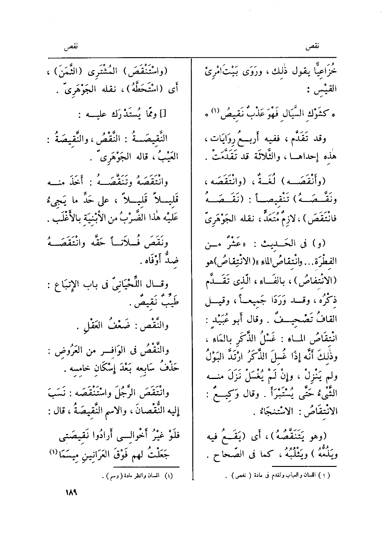 خُزَاعِيّاً يَقُول ذلِك، ورَوَى بَيْتَ امْرِئ القيْسِ: كشَوْكِ السَّيَالِ فَهْوَ عَذْبٌ نَقِيصُ وَقد تَقَدَّم، فَفِيهِ أَربعُ رِوَايَات، هذِه إِحداها، والثَّلاثَة قد تَقَدَّمَتْ. وأَنْقَصَه لُغَةٌ، وانْتَقَصَه، ونَقَّصَهُ تَنْقِيصاً: نَقَصَهُ فانْتَقَصَ، لازِمٌ مُتَعَدٍّ، نَقله الجَوْهَرِيّ فِي الحَدِيث: عَشْرٌ من الفِطْرَةِ وانْتِقاصُ الماءِ الانْتِقاصُ هُوَ الانْتِفاصُ، بالفَاءِ، الّذِي تَقَدَّم ذِكْرُه، وَقد وَرَدَا جَمِيعاً، وَقيل)