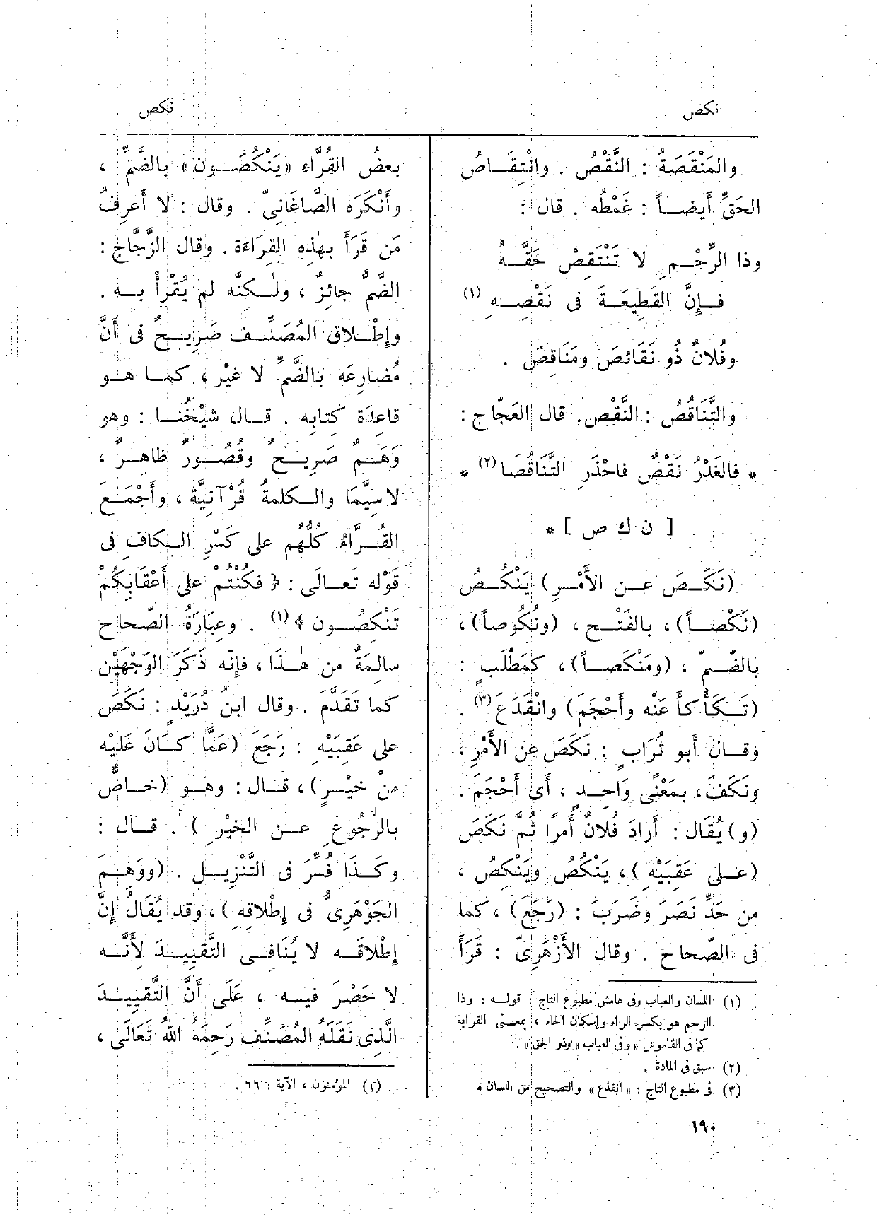 نَكَصَ عَن الأَمْرِ يَنْكُصُ نَكْصاً، بالفَتْح، ونُكُوصاً، بالضَّمّ، ومُنْكَصاً، كمَطْلَبٍ، تَكَأْكأَ عَنْه وأَحْجَمَ وانْقَدَعَ. وَقَالَ أَبو تُرَابٍ: نَكَصَ عَن الأَمْرِ، ونَكَفَ، بمَعْنَىً وَاحِدٍ، أَي أَحْجَمَ. يُقَال: أَرادَ فُلانٌ أَمراً ثُمَّ نَكَصَ، من حَدِّ نَصَرَ وضَرَبَ: رَجَعَ، كَمَا فِي الصّحاح. وَقَالَ الأَزْهَرِيّ: قَرَأَ بعضُ القُرَّاءِ يَنْكُصُون بالضَّمِّ، وأَنْكَرَه الصَّاغَانِيّ. وَقَالَ: لَا أَعْرِفُ مَن قَرَأَ بهذِه القِرَاءَة. وَقَالَ الزَّجَّاج: الضَّمُّ جائِزٌ، ولكنَّه لم يُقْرأْ بِهِ. وإِطْلاق المُصَنِّف صَرِيحٌ فِي أَنَّ مُضارِعَه بالضَّمِّ لَا غيْر، كَمَا هُوَ قاعِدَة كِتابِه. قَالَ شيْخُنا: وَهُوَ وَهَمٌ صَرِيحٌ وقُصُورٌ ظاهِرٌ، لَا سِيَّمَ والكلمةُ قُرْآنِيَّة، وأَجْمَعَ القُرَّاءُ كُلُّهُم على كَسْرِ الكافِ فِي قَوْله تَعالَى: فكُنْتُمْ على أَعْقَابِكُمْ تَنْكِصُون.