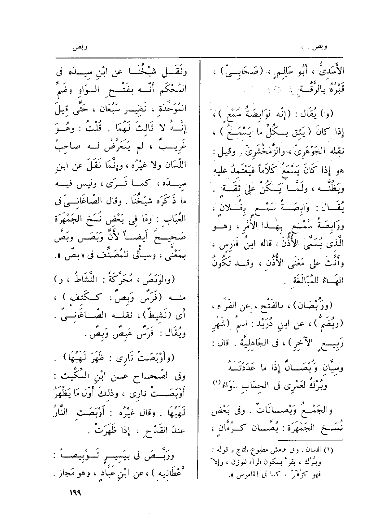 وَالْجمع} وَبصْانَاتٌ. وَفِي بعض نُسَخ الجَمْهَرَة: بُصَّان كرُمَّانٍ، ونَقَل شيْخُنَا عَن ابْنِ سِيدَه فِي المُحْكَم أَنّه بفَتْحِ الوَاوِ وضَمِّ المُوَحَّدةِ، نَظِير سَبُعَان، حَتَّى قِيلَ إِنَّهُ لَا ثَالِثَ لَهُمَا. قُلْتُ: وهُوَ غَرِيبٌ، لم يَتَعَرَّضْ لَهُ صاحِبُ اللّسَان وَلَا غيْرُه، وإِنَّمَا نَقَلَ عَن ابنِ سِيدَه، كَمَا تَرَى، وَلَيْسَ فِيهِ مَا ذَكَرَه شيْخُنَا. وَقَالَ الصّاغَانِيّ فِي العُبَابِ: ومَا فِي بَعْضِ نُسَخ الجَمْهَرَة صَحِيحٌ أَيضاً لأَنَّ وَبَصَ وبَصَّ بمَعْنىً، وسيأْتي للمُصَنِّف فِي بصّ. {والوَبَصُ، مُحَرَّكَةً: النَّشَاطُ، وَمِنْه فَرَسٌ} وَبِصٌ، ككَتِفٍ، أَي نَشِيطٌ، نَقله الصّاغَانِيّ. ويُقَال: فَرَسٌ هَبِصٌ وَبِصٌ. {وأَوْبَصَتْ نَارِي: ظَهَرَ لَهَبُهَا. وَفِي الصّحاح عَن ابْنِ السِّكِّيت:} أَوْبَصَتْ نَارِي، وذلِكَ أَوّل مَا يَظْهَرُ لَهَبُهَا. وَقَالَ غيْرُه: {أَوْبَصَتِ النَّارُ عندَ القَدْحِ، إِذا ظَهَرَتْ.} ووَبَّصَ لي بيَسِيرٍ! تَوْبِيصاً: أَعْطَانِيهِ، عَن ابْنِ عَبَّادٍ، وَهُوَ مَجاز.