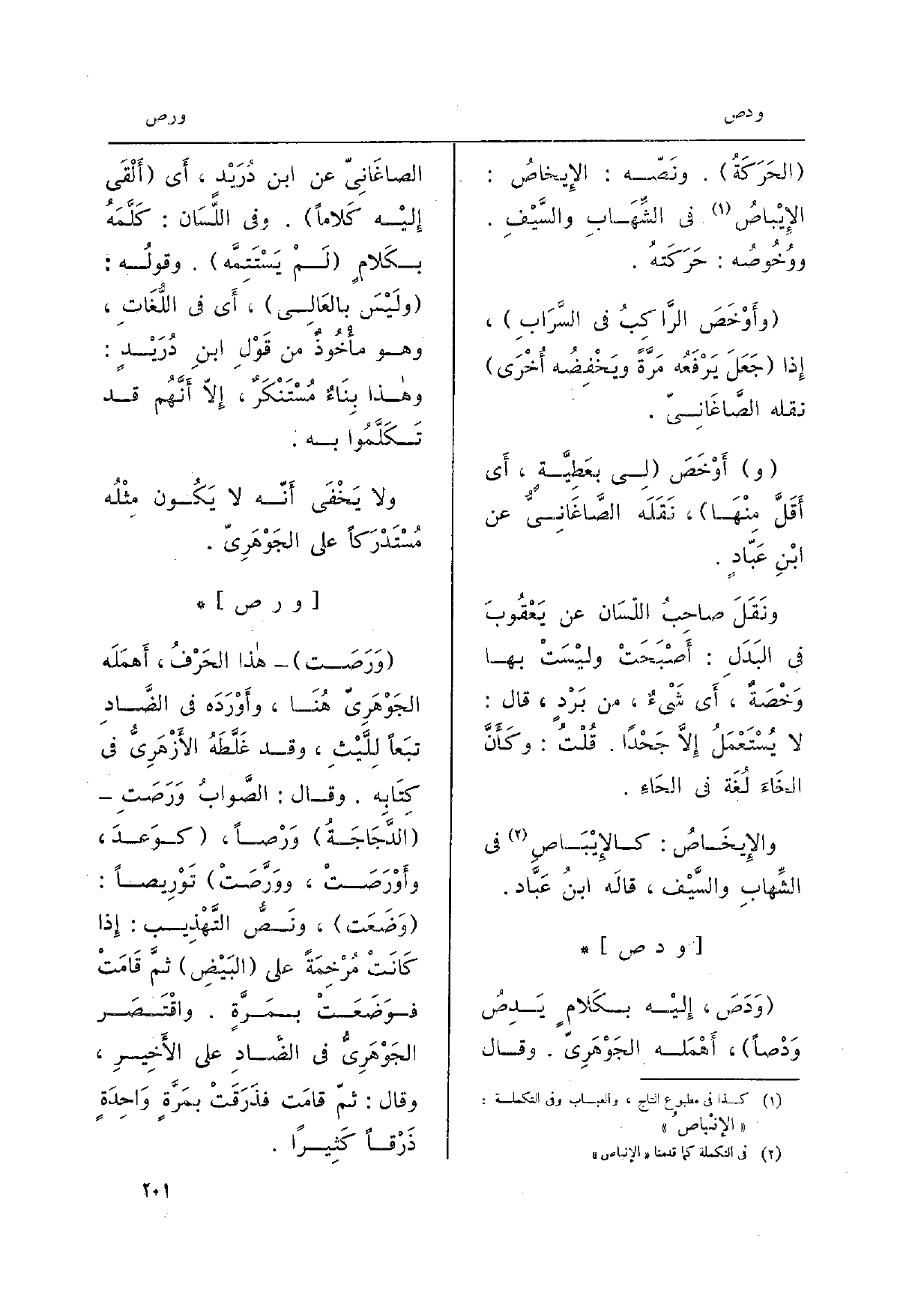 } وَدَصَ، إِليْه بكَلامٍ {يَدِصُ} وَدْصاً، أَهْمَله الجَوْهَرِيّ، وَقَالَ الصاغَانِيّ عَن ابْن دُرَيْدٍ، أَي أَلْقَى إِليْه كَلاماً. وَفِي اللّسَان: كَلَّمَهُ بكَلامٍ لَمْ يَسْتَتِمَّه. وقولُه: ولَيْسَ بالعَالِي، أَي فِي اللُّغَاتِ، وَهُوَ مأْخُوذٌ من قَوْلِ ابنِ دُرَيْدٍ: وَهَذَا بِنَاءٌ مُسْتَنْكَرٌ، إِلاّ أَنَّهُم قد تَكَلَّمُوا بِهِ. وَلَا يَخْفَى أَنّه لَا يَكُون مِثْلُه مُسْتَدْرَكاً على الجَوْهَرِيّ.
