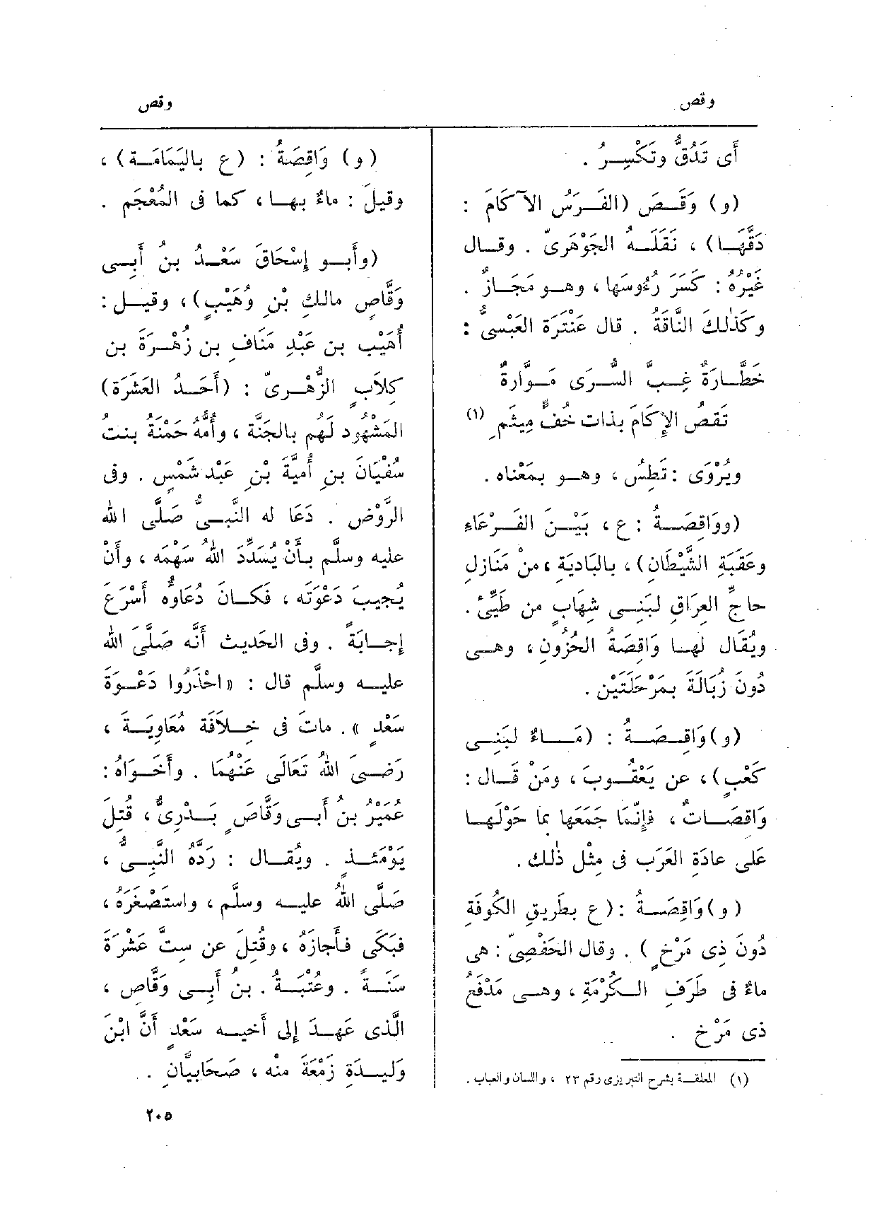 ويُرْوَى: تَطِسُ، وَهُوَ بمَعْناه. {ووَاقِصَةُ: ع، بَيْنَ الفَرْعَاءِ وعَقَبَةِ الشَّيْطَانِ، بالبَاديَةِ، منْ مَنَازلِ حاجِّ العِرَاقِ لبَنِي شِهَابٍ من طَيِّء. ويُقَال لَهَا} وَاقِصَةُ الحُزُونِ، وَهِي دُونَ زُبَالَةَ بمَرْحَلَتَيْن. و {وَاقِصَةُ: ماءٌ لبَنِي كَعْبٍ، عَن يَعْقُوبَ، ومَنْ قَال:} وَاقِصَاتٌ، فإِنّمَا جَمَعَها بِمَا حَوْلَها عَلى عادَةِ العَرَب فِي مِثْل ذَلِك. وَاقِصَةُ: ع بطَرِيقِ الكُوفَةِ دُونَ ذِي مَرْخٍ. وَقَالَ الحَفْصِيّ: هِيَ ماءٌ فِي طَرَفِ الكُرْمَةِ، وَهِي مَدْفَعُ ذِي مَرْخ. وَاقِصَةُ: ع باليَمَامَة وقيلَ: ماءٌ بهَا: كَمَا فِي المُعْجَم. وأَبو إِسْحَاقَ سَعْدُ بنُ أَبِي! وَقَّاصِ مالكِ بْنِ وُهَيْبٍ، وَقيل: أُهَيْب بن عَبْدِ مَنَافِ بن زُهْرَةَ بن كِلاَبٍ الزُّهْريّ: أَحدُ العَشَرَة المَشْهُود لَهُم بالجَنَّة، وأُمُّهُ حَمْنَةُ بنتُ سُفْيَانَ بنِ أُميَّةَ بْنِ عَبْد شَمْسٍ. وَفِي الرَّوْض. دَعَا لَهُ النَّبيُّ صَلَّى الله عَلَيْهِ وسلَّم بأَنْ يُسَدِّدَ اللهُ سَهْمَه، وأَنْ يُجيبَ دَعْوَتَه، فَكانَ دُعَاؤُه أَسْرَعَ إِجابَةً. وَفِي الحَدِيث أَنَّه صَلَّىَ الله عَلَيْهِ وسلَّم قَالَ: احْذَرُوا دَعْوَةَ) سَعْدٍ. ماتَ فِي خِلاَفَة مُعَاوِيَةَ، رَضيَ اللهُ تَعَالَى عَنْهُمَا. وأَخَوَاهُ: عُمَيْرُ بنُ أَبي وَقَّاصٍ بَدْرِيٌّ، قُتِلَ يَوْمَئذٍ: ويُقال: رَدَّهُ النَّبِيُّ، صَلَّى اللهُ عَلَيْهِ وسلَّم، واستَصْغَرَهُ، فبَكَى فأَجازَهُ، وقُتِلَ عَن سِتَّ عَشْرَةَ سَنَةً. وعُتْبَةُ. بنُ أَبِي وَقَّاصٍ، الَّذي عَهدَ إِلى أَخيه سَعْدٍ أَنَّ ابْنَ وَليدَةِ زَمْعَةَ منْه، صَحَابيَّانِ.