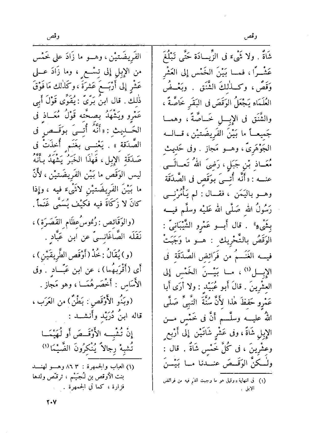 وعِشْرِينَ، فِي كُلَّ خًمْسٍ شَاةٌ. قَالَ: ولكنَّ الوَقَصَ عندنَا مَا بَيْنَ الفَرِيضَتيْن، وَهُوَ مَا زَادَ على خَمْس من الإِبِلِ إِلى تِسْعٍ، وَمَا زَاد على عَشْرٍ إِلى أَرْبَعَ عَشَرَةَ، وكَذلك مَا فَوْقَ ذلِك. قَالَ ابنُ بَرِّيّ: يُقَوِّي قَوْلَ أَبِي عَمْرٍ وويَشْهَدُ بصِحَّتِه قَوْلُ مُعَاذٍ فِي الحَدِيثِ: أَنَّهُ أُتِيَ بوَقَصٍ فِي الصَّدَقَةِ. يَعْنِي بغَنَمٍ أُخِذَتْ فِي صَدَقَةِ الإِبِل، فَهذَا الخَبَرُ يَشْهَدُ بأَنَّهُ لَيْسَ الوَقَص مَا بَيْن الفَرِيضَتيْن، لأَنّ مَا بَيْنَ الفَرِيضَتيْنِ لَا شَيْءَ فِيهِ، وإِذا كانَ لَا زَكاَةَ فِيهِ فكيْف يُسَمَّى غَنَماً.} والوَقَّائِص: رُءُوسِ عِظَامِ القَصَرَةِ، نَقَلَه الصَّاغَانِيّ عَن ابْن عَبّادٍ. يُقَالُ: خُذْ أَوْقَص الطَّرْيقَيْنِ، أَي أَقْرَبهُما، عَن ابْن عَبّادٍ. وَفِي الأَسَاسِ: أَخْصَرهُمَا، وَهُوَ مَجاز. وبَنُو {الأَوْقَصِ: بَطْنٌ من العَرَب، قَالَه ابنُ دُرَيْدٍ وأَنشد. إِنْ تُشْبِه} الأَوْقَصَ أَو لُهَيْمَا تُشبِهْ رِجالاً يُنْكِرُونَ الضَّيْمَا