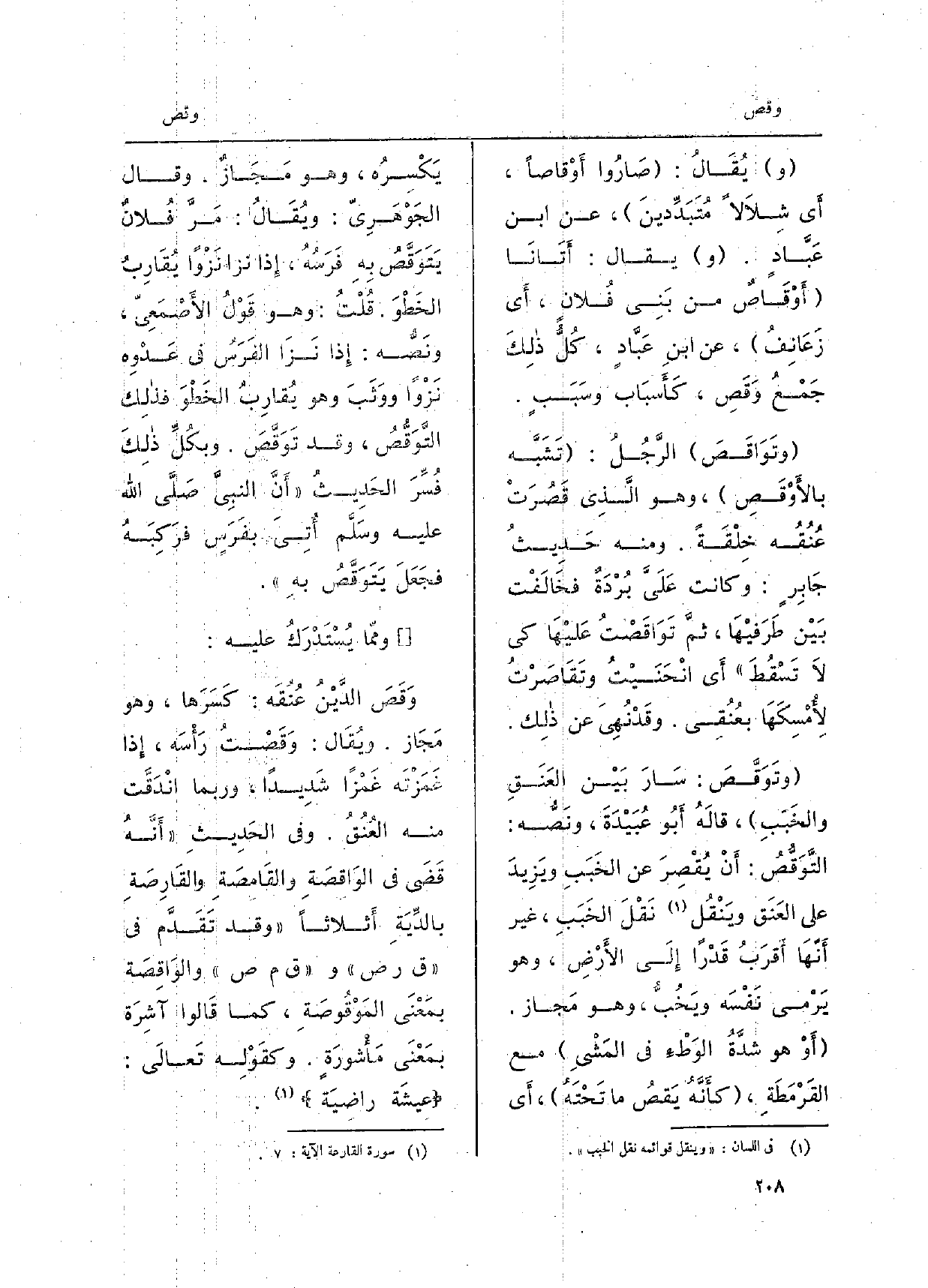 يُقَالُ: صَارُوا {أَوْقاصاً، أَي شِلاَلاً مُتَبَدِّدينَ، عَن ابْن عَبَّادٍ. يُقَال: أَتَانَا} أَوْقَاصٌ من بَنِي فُلانٍ، أَي زَعَانِفُ، عَن ابنِ عَبَّادٍ، كُلُّ ذلِكَ جَمْعُ وَقَصِ، كَأَسبَاب وسَبَبٍ. {وتَوَاقَصَ الرَّجُلُ: تَشَبَّه بالأَوْقَصِ، وَهُوَ الَّذِي قَصُرَتْ عُنُقُه خِلْقَةً. وَمِنْه حَدِيثُ جَابِرٍ: وَكَانَت عَلَيَّ بُرْدَةٌ فخَالَفْت بَيْن طَرَفيْهَا، ثمَّ} تَوَاقَصْتُ عَليْهَا كي لاَ تَسْقُطَ أَي انْحَنَيْتُ وتَقَاصَرْتُ لأُمْسِكَهَا بعُنُقِي. وقَدْ نُهِيَ عَن ذلِك. {وتَوَقَّصَ: سَارَ بَيْن العَنَقِ والخَبَبِ، قالَهُ أَبُو عُبَيْدَةَ ونَصُّه:} التَّوَقُّصُ: أَنْ يُقْصِرَ عَن الخَبَبِ ويَزِيدَ على العَنَق ويَنْقُل نَقْلَ الخَبَبِ، غير أَنّهَا أَقرَبُ قَدْراً إِلَى الأَرْضِ، وَهُوَ يَرْمي نَفْسَه ويَخُبُّ، وَهُوَ مَجاز. أَوْ هُوَ شدَّةُ الوَطْءِ فِي المَشْيِ مَعَ القَرْمَطَةِ، كأَنَّهُ يَقصُ مَا تَحْتَهُ، أَي يَكْسِرُه، وَهُوَ مَجَازٌ. وَقَالَ الجَوْهَرِيّ: ويُقَالُ: مَرَّ فُلانٌ {يَتَوَقَّصُ بِهِ فَرَسُهُ، إِذا نزا نَزْواً يُقَارِبُ الخَطْوَ. قُلْتُ: وَهُوَ قُوْلُ الأَصْمَعِيّ، ونَصُّه: إِذا نَزَا الفَرَسُ فِي عَدْوِه نَزْواً ووَثَبَ وَهُوَ يُقَارِبُ الخَطْوَ فذلِك} التَّوَقُّصُ، وَقد {تَوَقَّصَ. وبكُلِّ ذلِكَ فُسِّرَ الحَدِيثُ أَنَّ النبِيَّ صَلَّى الله عَلَيْهِ وسَلَّم أُتِيَ بفَرَسٍ فرَكِبَهُ فجَعَلَ} يَتَوَقَّصُ بهِ. وممّا يُسْتَدْرَكُ عَلَيْهِ: {وَقَصَ الدَّيْنُ عُنُقَه: كَسَرَها، وَهُوَ مَجاز. ويُقَال: وَقَصْتُ رَأْسَه، إِذا غَمَزْتَه غَمْزاً شَدِيداً، وَرُبمَا انْدَقَّت مِنْهُ العُنُقُ. وَفِي الحَدِيثِ أَنَّهُ قَضَى فِي} الوَاقِصَةِ والقَامصَةِ والقَارِصَةِ بالدِّيَةِ أَثلاثاً وَقد تَقَدَّم فِي ق ر ص وق م ص {والوَاقِصَة بمَعْنَى} المَوْقُوصَةِ، كَمَا قَالوا آشِرَة بمَعْنَى مَأْشورَةٍ. وكقَوْلِه تَعالَى: عيشَة راضِيَة.