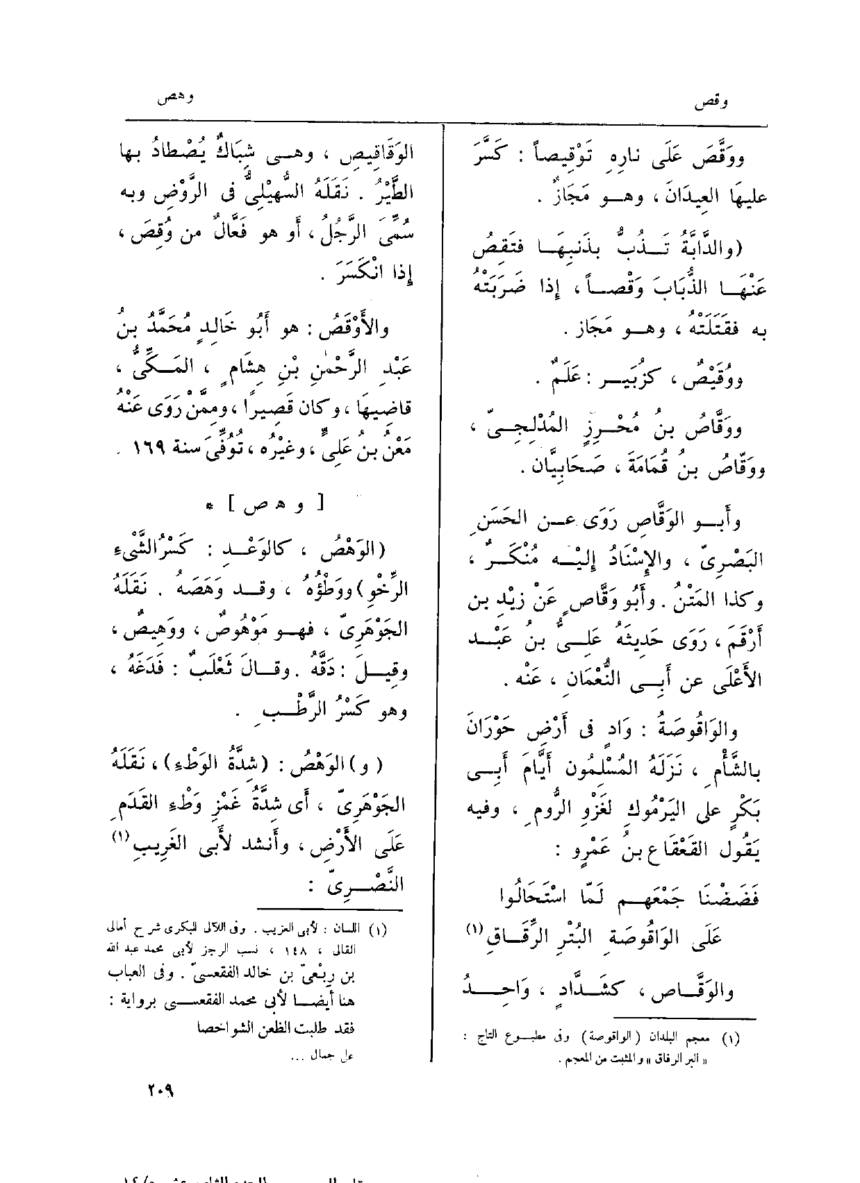 فتَقصُ عَنْهَا الذُّبَابَ {وَقْصاً: إِذا ضَرَبَتْهُ بِهِ فقَتَلَتْهُ، وَهُوَ مَجَاز.} ووُقَيْصٌ، كزُبَير: عَلَمٌ. {ووَقَّاصُ بنُ مُحْرِزٍ المُدْلِجِيّ،} ووَقَّاصُ بنُ قُمَامَةَ، صَحَابِيَّان. وأَبو {الوَقَّاصِ رَوَى عَن الحَسَنِ البَصْرِيّ، والإِسْنَادُ إِليْه مُنْكَرٌ، وَكَذَا المَتْنُ. وأَبُو} وَقَّاصٍ عَنْ زيْد بن أَرْقَمَ، رَوَى حَدِيثَهُ عَلِيُّ بنُ عَبْد الأَعْلَى عَن أَبِي النُّعْمَانِ، عَنْه. {والوَاقُوصَةُ: وَادٍ فِي أَرْضِ حَوْرَانَ بالشَّأْمِ، نَزَلَهُ المُسْلِمُون أَيَّامَ أَبِي بَكْرٍ على اليَرْمُوكِ لغَزْوِ الرُّومِ، وَفِيه يَقُول القَعْقَاع بنُ عَمْرٍ و: