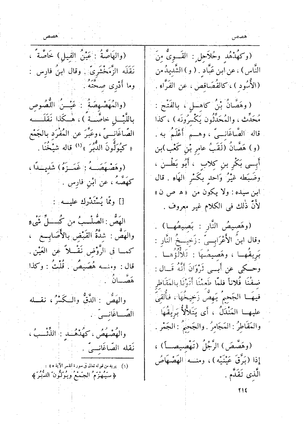 وكهُدْهُدٍ وحُلاَحِلٍ: القَوِيُّ مِنَ النَّاس، عَن ابْن عَبَّادٍ. الشَّدِيدُ من الأُسُودِ، كالقُصَاقِص، عَن الفَرَّاءِ. {وهَصَّانُ بْنُ كاهِلٍ، بالفَتْح: مُحَدِّث، والمُحَدِّثُون يَكْسِرُونَه، كَذَا قَالَه الصَّاغَانِيّ، وهم أَعْلَمُ بِهِ. و} هَصَّانُ لَقَبُ عامِرِ بْنِ كَعْب بن أَبِي بَكْرِ بنِ كِلابٍ، أَبُو بَطْن، وضَبَطه غيْرُ وَاحدٍ بكَسْرِ الهَاءِ. قَالَ ابْن سَيّده: وَلَا يكون من هـ ص ن لأَنّ ذَلِك فِي الْكَلَام غير مَعْرُوف. {وهَصِيصُ النَّارِ: بَصِيصُها. وَقَالَ ابنُ الأَعْرَابِيّ: زَخِيخُ النَّارِ، بَرِيقها،} وهَصِيصُهَا: تَلأْلُؤُها. وَحكى عَن أَبي ثَرْوَانَ أَنَّه قَال: ضِفْنَا فُلاناً فلمّا طَعِمْنَا أَتَوْنَا بالمَقَاطِرِ فيهَا الجَحِيمُ {يَهِصُّ زَخِيخُهَا، فأُلقِي عَلَيْهَا المَنْدَلُ، أَي يَتَلأْلأُ بَرِيقُهَا والمَقَاطِرُ، المَجَامِرُ.
