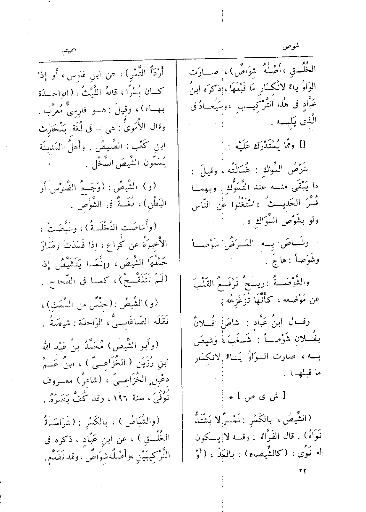 وَبِهِمَا فُسِّرَ الحَدِيثُ اسْتَغْنُوا عَن النّاس وَلَو {بشَوْص السِّوَاكِ.} وشَاصَ بِه المَرَضُ {شَوْصاً} وشَوَصاً: هاجَ. {والشَّوْصَةُ: ريحٌ تَرْفَعُ القَلْبَ عَن مَوْضعه، كأَنَّهَا تُزَعْزِعُه. وَقَالَ ابنُ عَبَّادٍ:} شاصَ فُلانٌ بفُلانٍ {شَوْصاً: شَغَبَ،} وشيصَ بِهِ، صَارَت الوَاوُ يَاءً لانكِسَار مَا قبلهَا.