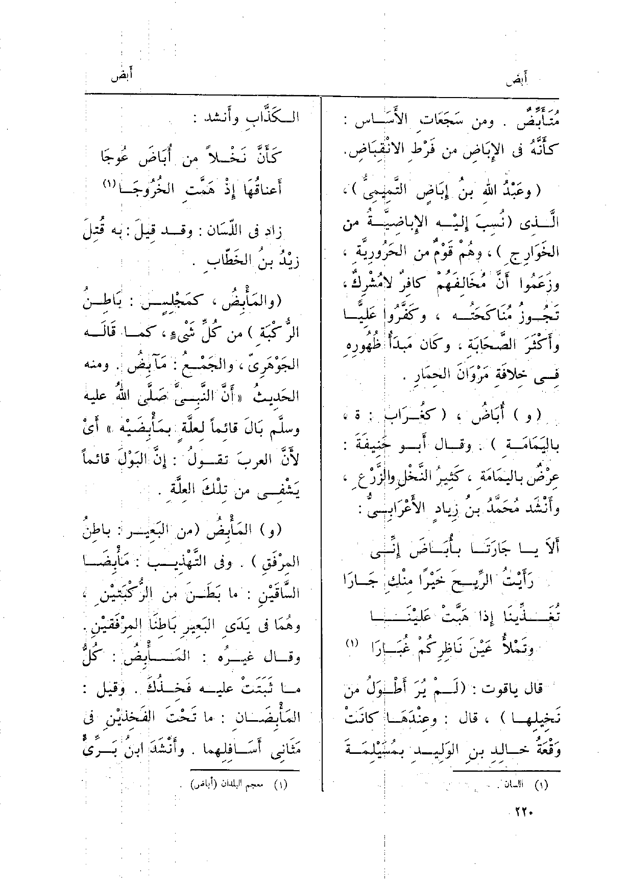{مُتَأَبِّضٌ. وَمن سَجَعَاتِ الأَسَاس: كأَنَّهُ فِي} الإِبَاضِ من فَرْطِ الانْقِبَاضِ. وعَبْدُ اللهِ بنُ إِبَاضٍ التَّمِيمِيُّ، الَّذِي نُسِبَ إِليْه الإِبَاضِيَّةُ من الخَوَارِجِ، وهُمْ قَوْمٌ من الحَرُورِيَّةِ، وزَعَمُوا أَنَّ مُخَالِفَهُمْ كافِرٌ لَا مُشْرِكٌ، تَجُوزُ مُنَاكَحَتُه، وكَفَّرُوا عَلِيّاً وأَكْثَرَ الصَّحَابَةِ، وكَان مَبدَأُ ظُهُورِهِ فِي خِلاَفَةِ مَرْوَانَ الحِمَارِ. و {أُبَاضُ، كغُرَاب: ة، باليَمَامَةِ. وَقَالَ أَبو حَنِيفَةَ: عِرْضٌ باليمَامةِ، كَثِيرُ النَّخْلِ والزَّرْعِ، وأَنْشَد مُحَمَّدُ بنُ زِيادٍ الأَعْرَابِيُّ: