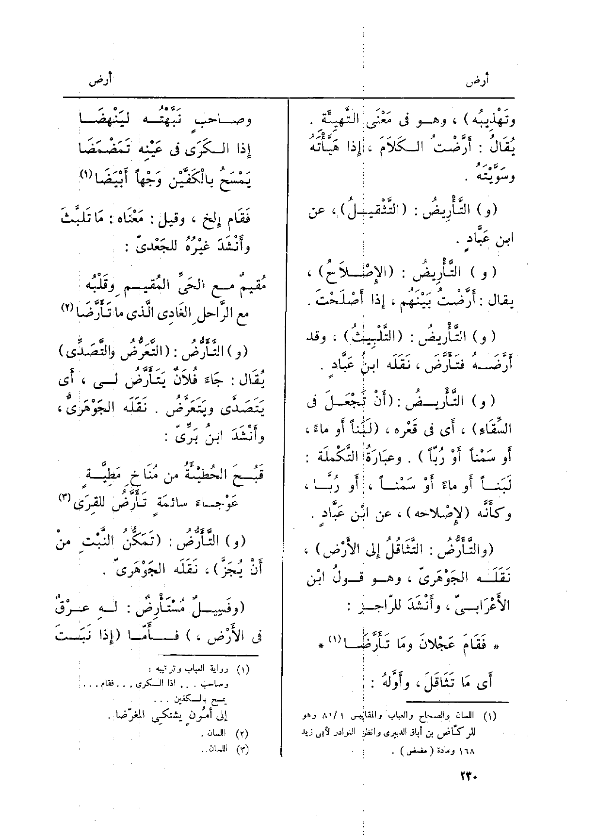 ِ وتَهْذِيبُه، وَهُوَ فِي مَعْنَى التَّهيئَةِ. يُقَالُ: أَرَّضْتُ الكَلاَمَ، إِذا هَيَّأْتَهُ وسَوَّيْتَهُ. التَّأْرِيضُ: التَّثْقيلُ، عَن ابْن عَبَّادٍ. التَّأْرِيضُ: الإِصْلاَحُ، يُقَال: {أَرَّضْتُ بَيْنَهُم، إِذا أَصْلَحْتَ. التَّأْرِيضُ: التَّلْبِيثُ، وَقد} أَرَّضَهُ {فتَأَرَّضَ، نَقَلَه ابنُ عَبَّادٍ. التَّأْرِيضُ: أَنْ تَجْعَلَ فِي)