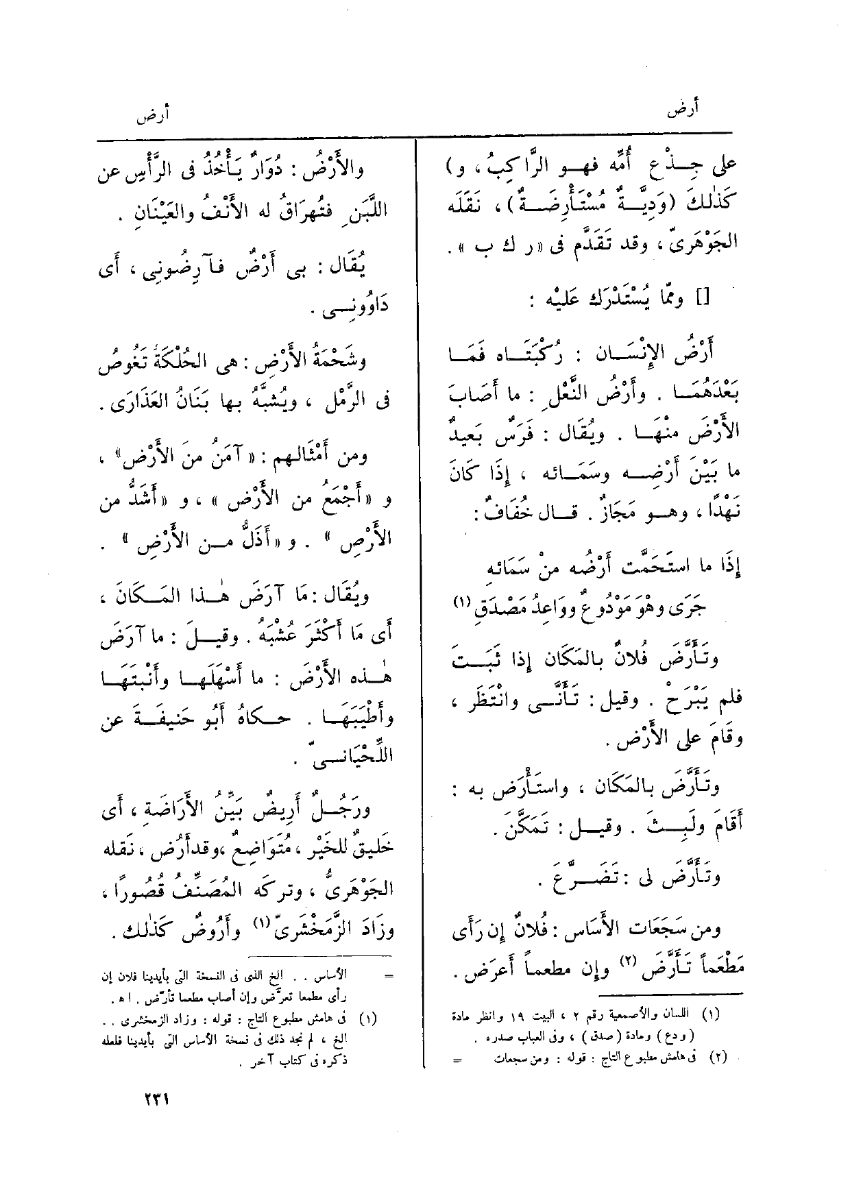{وتأَرَّضَ فُلانٌ بالمَكَان إِذا ثَبَتَ فَلم يَبْرَحْ. وَقيل: تَأَنَّى وانْتَظَر، وقَامَ على الأَرْض. وتَأَرَّضَ بالمَكَان،} واستَأْرَض بِهِ: أَقَامَ ولَبِثَ. وَقيل: تَمَكَّنَ. {وتَأَرَّضَ لي: تَضَرَّعَ. وَمن سَجَعَات الأَسَاس: فُلانٌ إِن رَأَى مَطْمَعاً تَأَرَّض وإِن مطمعاً أَعرَض.} والأَرْضُ: دُوَارٌ يَأْخُذُ فِي الرَّأْسِ عَن اللَّبَنِ فتُهرَاقُ لَهُ الأَنْفُ والعَيْنَانِ. يُقَال: بِي {أَرضٌ} - فآرِضُونِي، أَي دَاوُونِي. وشَحْمَةُ الأَرْضِ: هِيَ الحُلْكَةُ تَغُوصُ فِي الرَّمْل، ويُشبَّهُ بهَا بَنَانُ العَذَارَى. وَمن أَمْثَالهم: آمَنُ منَ الأَرْض، وأَجْمَعُ من الأَرْض، وأَشَدُّ من الأَرْصِ. وأَذَلُّ من الأَرْضِ. ويُقَال: مَا {آرَضَ هَذَا المَكَانَ أَي مَا) أَكْثَرَ عُشْبَهُ. وقيلَ: مَا آرَضَ هَذِه الأَرْضَ: مَا أَسْهَلَها وأَنْبَتَها وأَطْيَبَهَا. حكاهُ أَبُو حَنيفَةَ عَن اللِّحْيَانيّ. ورَجُلٌ} أَرِيضٌ بَيِّنُ {الأَرَاضَةِ، أَي خَليقٌ للخَيْر، مُتَوَاضِعٌ، وَقد أَرُض، نَقله الجَوْهَرِيُّ، وتركَه المُصَنِّفُ قُصُوراً، وزَادَ الزَّمَخْشَريّ} وأَرُوضٌ كَذلك.