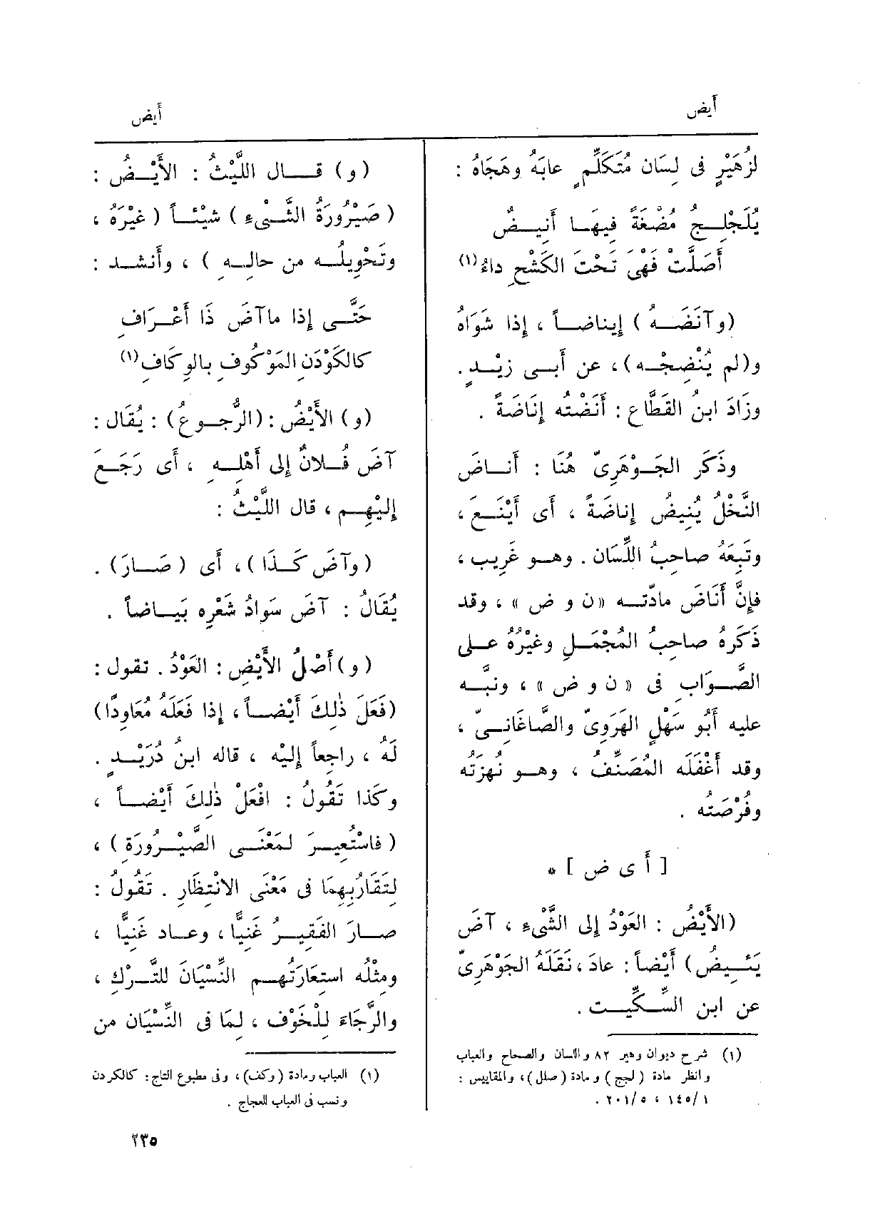 {الأَيْضُ: العَوْدُ إِلى الشَّيْءِ،} آضَ {يَئيِضُ} أَيْضاً: عادَ، نَقَلَهُ الجَوْهَرِيّ عَن ابْن السِّكِّيت. قَالَ اللَّيْثُ: الأَيْضُ: صَيْرُورَةُ الشَّيْءِ شيْئاً غيْرَهُ، وتَحْوِيلُه من حَالِهِ، وأَنشد: حَتَّى إِذا مَا {آضَ ذَا أَعْرَافِ كالكَوْدَنِ المَوْكُوفِ بالوِكَافِ الأَيْضُ: الرُّجوعُ: يُقَال: آضَ فُلانٌ إِلى أَهْلِهِ، أَي رَجَعَ إِليْهِم، قَالَ اللَّيْثُ:} وآضَ كَذَا، أَي صَارَ. يُقَالُ: آضَ سَوادُ شَعْرِه بَياضاً. أَصْلُ الأَيْضِ: العَوْدُ. تَقول: فَعَلَ ذلِكَ أَيْضاً، إِذا فَعَلَهُ مُعَاوِداً لَهُ، راجِعاً إِليْه، قَالَه ابنُ دُرَيْدٍ. وكَذَا تَقُولُ: افْعَلْ ذلِكَ! أَيضاً، فاسْتُعِيرُ لمَعْنَى الصَّيْرُورَةِ، لِتَقَارُبِهِمَا فِي مَعْنَى الانْتِظَارِ. تَقُولُ: صارَ الفَقِيرُ غَنِيّاً، وَعَاد غَنِيّاً، ومِثْلُه استِعَارَتُهم النِّسْيَانَ للتَّرْكِ، والرَّجَاءَ لِلْخَوْف، لِمَا فِي النِّسْيَان من