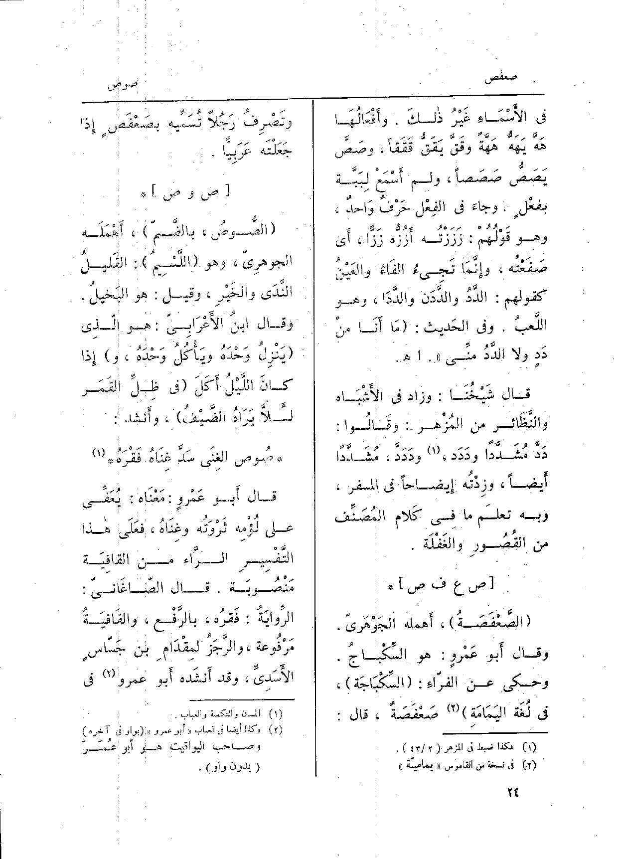 وَقَالَ ابنُ الأَعْرَابِيّ: هُوَ الّذِي يَنْزِلُ وَحْدَهُ ويَأْكُلُ وَحْدَهُ، وإِذا كانَ اللَّيْلُ أَكَلَ فِي ظِلِّ القَمَر لئَلاَّ يَرَاهُ الضَّيْفُ، وأَنشد:! صُوص الغِنَى سَدَّ غِنَاهُ فَقْرَهُ قَالَ أَبو عَمْروٍ: مَعْنَاه: يُعَفِّي على لُؤْمِه ثَرْوَتُه وغِنَاهُ، فعَلَى هَذَا التَّفْسِيرِ الرَّاء من القافِيَة مَنْصُوبَة. قَالَ الصّاغَانيّ: الرِّوايَةُ: فَقرُه، بالرَّفْع، والقَافيَةُ مَرْفُوعة، والرَّجَزُ لِمقْدَامٍ بن جَسّاسٍ الأَسَدِيِّ، وَقد أَنشَده أَبو عَمْرو فِي