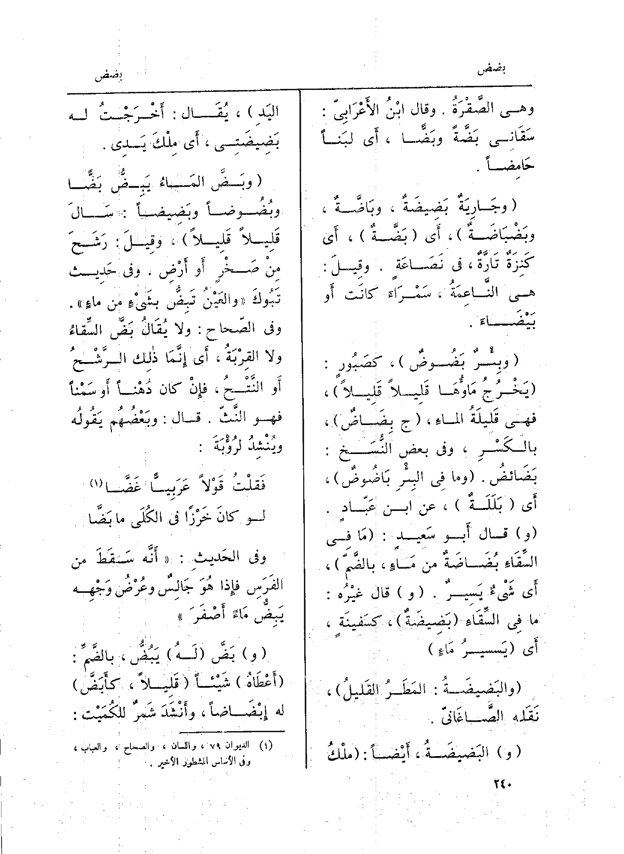 وقِيلَ: بَيْضَاءَ. وبِئْرٌ {بَضُوضٌ، كصَبُورٍ: يَخْرُجُ مَاؤُهَا قَلِيلاً قَلِيلاً، فَهِيَ قَلِيلَةُ الماءِ، ج} بِضَاضٌ، بالكَسٍرِ، وَفِي بعض النُّسَخ: {بَضَائِضُ. وَمَا فِي البِئْرِ بَاضُوضٌ، أَي بَلَلَةٌ، عَن ابْن عَبّادٍ. قَالَ أَبو سَعِيدٍ: مَا فِي السِّقَاءِ} بُضَاضَةٌ من مَاءٍ، بالضَّمّ، أَي شَيْءٌ يَسِيرٌ. قَالَ غيْرُه: مَا فِي السِّقَاءِ بَضِيضَةٌ، كسَفِينَةٍ، أَي يَسِيرُ مَاءٍ {والبَضِيضَةُ: المَطَرُ القَلِيلُ، نَقَلَه الصَّاغَانيّ.