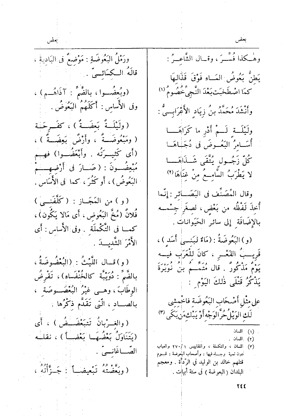 وَقَالَ المُصَنِّف فِي البَصَائِر: إِنّما أُخِذَ لَفْظُه من بَعْضٍ، لصِغَرِ جِسْمه بالإِضَافَةِ إِلى سَائر الحَيَوانات. البَعُوضَةُ: مَاءٌ لبَنِي أَسَدٍ، قَرِيبُ القَعْرِ، كانَ لِلْعَرَب فِيهِ يَوْمٌ مَذْكُورٌ. قَالَ مُتَمِّمُ بنُ نُوَيْرَةَ يَذْكُرُ قَتْلَى ذلِكَ اليَوْمِ: