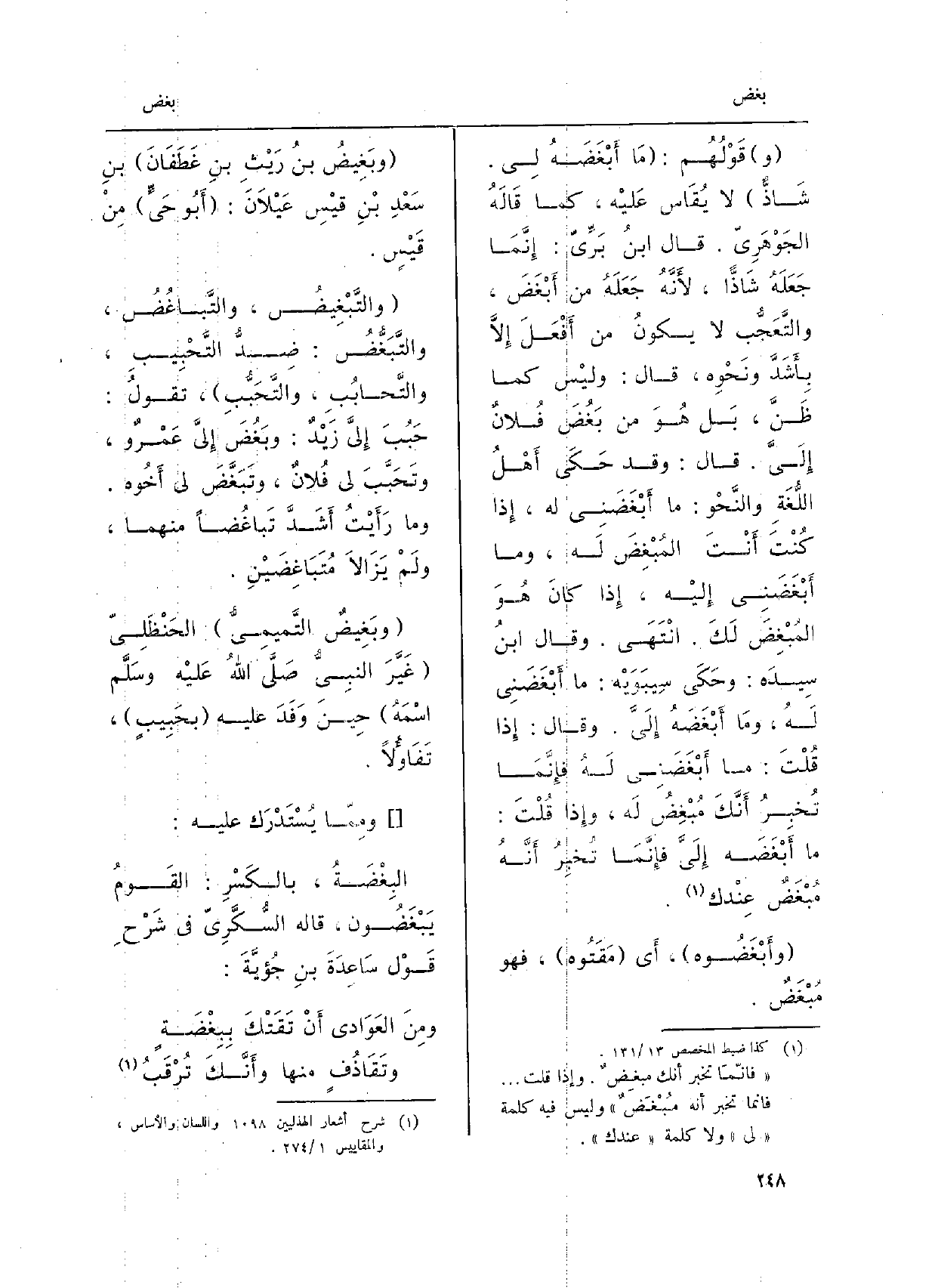 قَوْلُهُم: مَا أَبْغَضَهُ لِي. شَاذٌّ لَا يُقَاس عَليْه، كَمَا قَالَهُ الجَوْهَرِيّ. قَالَ ابنُ بَرِّيّ: إِنَّمَا جَعَلَهُ شَاذّاً، لأَنَّهُ جَعَلَهُ من أَبْغَضَ، والتَّعَجُّب لَا يكونُ من أَفْعَلَ إِلاَّ بِأَشَدَّ ونَحْوِه، قَالَ: وليْس كَمَا ظَنَّ، بَل هُوَ من بَغُضَ فُلانٌ إِلَيَّ. قَالَ: وَقد حَكَى أَهْلُ اللُّغَةِ والنَّحْو: مَا أَبْغَضَنِي لَهُ، إِذا كُنْتَ أَنْتَ المُبْغِضَ لَه، وَمَا أَبْغَضَنِي إِليْه، إِذا كانَ هُوَ المُبْغِضَ لَكَ. انْتَهَى. وَقَالَ ابنُ سِيدَه: وحَكَى سِيبَوَيْه: مَا أَبْغَضَنِي لَهُ، ومَا أَبْغَضَنِي لَهُ فإِنَّمَا تُخبِرُ أَنَّكَ مُبْغِضُ لَه، وإِذا قُلْتَ: مَا أَبْغَضَه إِلَيَّ فإِنَّمَا تُخبِرُ أَنَّهُ مُبْغَضٌ عِنْدَك. وأَبْغَضُوه، أَي مَقَتُوه، فَهُوَ مَبْغَضٌ. وبَغِيضُ بنُ رَيْثِ بنِ غَطَفَانَ بنِ سَعْدِ بْنِ قيْسِ عَيْلاَنَ: أَبُو حَيٍّ مِنْ قَيْسٍ. والتَّبْغِيضُ، والتَّباغُضُ، والتَّبَغُّضُ: ضِدُّ التَّحْبِيبِ، والتَّحابُبِ، والتَّحَبُّبِ، تقولُ: حَبُبَ إِليَّ زَيْدٌ: وبَغُضَ إِليَّ عَمْرٌ و، وتَحَبَّبَ لي فُلانٌ، وتَبَغَّضَ لي أَخُوه. وَمَا رأَيْتُ أَشَدَّ تَباغُضاً مِنْهُمَا، ولَمْ يَزَالاَ مُتَبَاغِضَيْنِ. وبَغِيضٌ التَّمِيمِيُّ الحَنْظَلِيّ غَيَّرَ النبِيُّ صَلَّى اللهُ عَليْه وسَلَّم اسْمَهُ حِينَ وَفَدَ عَلَيْهِ بحَبِيبٍ، تَفَاؤُلاً. ومِمّا يُسْتَدْرَك عَلَيْهِ: البِغْضَةُ، بالكَسْرِ: القَومُ يَبْغَضُون، قَالَه السُّكَّرِيّ فِي شَرْحِ قَوْل سَاعِدَةَ بنِ جُؤيَّةَ: