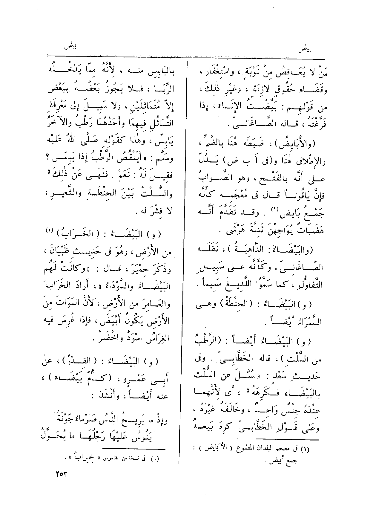 وَفِي حَديثِ سَعْدٍ: سُئِلَ عَن السُّلْت {بالبَيْضَاءِ فكَرِهَهُ، أَي لأَنَّهما عِنْدَهُ جِنْسٌ وَاحِدٌ، وخَالَفَهُ غيْرُهُ، وعَلى قَوْلِ الخَطَّابِيّ كرِهَ بَيْعهُ باليَابِسِ مِنْهُ، لأَنَّهُ مِمّا يَدْخُلُه الرِّبَا، فَلَا يَجُوزُ بَعْضُهُ ببَعْض إِلاّ مُتَمَاثِلَيْنِ، وَلَا سَبِيلَ إِلى مَعْرِفَةِ التَّمَاثُلِ فِيهِمَا وأَحَدُهُمَا رَطْبٌ والآخَرُ يَابِسٌ، وَهَذَا كقَوْلِهِ صَلَّى اللهُ عَليْه وسَلَّم: أَيَنْقُصُ الرَّطْبُ إِذا يَبِسَ فقِيلَ لَهُ: نَعَمْ. فنَهَى الحِنْطَةِ والشَّعيرِ، لَا قِشْرَ لَهُ. البَيْضَاءُ: الخَرَابُ من الأَرْضِ، وهُوَ فِي حَدِيثِ ظَبْيَانَ وذَكَرَ حِمْيَرَ، قَالَ: وكانَتْ لَهُم البَيْضَاءُ والسَّوْدَاءُ، أَرادَ الخَرَابَ والعَامِرَ من الأَرْضِ، لأَنَّ المَوَاتَ مِنَ الأَرْضِ يَكُونُ أَبْيَضَ، فإِذا غُرِسَ فِيهِ الغِرَاسُ اسْوَدَّ واخْضَرَّ. البَيْضَاءُ: القِدْرُ، عَن أَبِي عَمْرٍ و، كأُمّ} بَيْضَاءَ، عَنهُ أَيْضاً، وأَنْشَدَ: