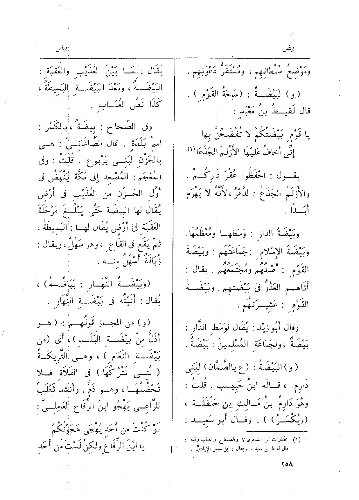 يَقُول: احْفَظُوا عُقْرَ دَارِكُمْ. والأَزْلَمُ الجَذَعُ: الدَّهْرُ، لأَنَّهُ لَا يَهْرَم أَبَداً. {وبَيْضَةُ الدارِ: وَسَطها ومُعْظَمُهَا. وبَيْضَةُ الإِسْلامِ: جَمَاعَتُهُم: وبَيْضَةُ القَوْمِ: أَصْلُهُم ومُجْتَمَعُهُم. يُقَال: أَتَاهم العَدُوُّ فِي} بَيْضَتهِم. وبَيْضَةُ القَوْمِ: عَشِيرَتهُم. وَقَالَ أَبُو زيْد: يُقَال لوَسَطِ الدَّارِ: بَيْضَةٌ، ولجَمَاعَةِ المُسْلِمينَ:) بَيْضَةٌ. البَيْضَةُ: ع بالصَّمَّان لِبَنِي دَارِم، قالَه ابنُ حَبِيب. قُلتُ: وهُوَ دَارِمُ بنُ مَالِكِ بن حَنْظَلَة، ويُكْسَرُ. وَقَالَ أَبو سَعِيد: يُقَال: لِمَا بَيْنَ العُذَيْبِ والعَقبَةِ: البَيْضَةُ، وبَعْدَ البَيْضَةِ البَسِيطَةُ كَذَا نَصُّ العُبَابِ. وَفِي الصّحاح: {بِيضَةُ، بالكَسْر: اسمُ بَلْدَةٍ. قَالَ الصَّاغَانِيّ: هِيَ بالحَزْنِ لبَنِي يَرْبوع. قُلْتُ: وَفِي المُعْجَم: المُصْعِد إِلى مَكَّة يَنْهَضُ فِي أَوَّلِ الحَزْنِ من العُذَيْبِ فِي أَرْضٍ يُقَال لَهَا البِيضَة حَتَّى يَبْلُغَ مَرْحَلَةَ العَقَبَةِ فِي أَرْضٍ يُقَال لَهَا: البَسِيطَةُ، ثمّ يَقَع فِي القَاعِ، وَهُوَ سَهْلٌ، وَيُقَال: زُبَالَةُ أَسْهَلُ مِنه.} وبَيْضَةُ النَّهَارِ:! بَيَاضُهُ، يُقَال: أَتَيْتُه فِي بَيْضَةِ النَّهَارِ. من الْمجَاز قَولُهم: هُوَ أَذَلُّ مِنْ بَيْضَةِ البَلَدِ، أَي من بَيْضَةِ النَّعَامِ، وَهِي التَّرِيكَةُ الَّتِي تَتْرُكُهَا فِي الفَلاةِ فَلَا تَحْضَنُهَا، وَهُوَ ذَمٌّ. وأَنشد ثَعْلَبٌ للرَّاعِي يَهْجُو ابنَ الرِّقَاع العَامِلِيّ: