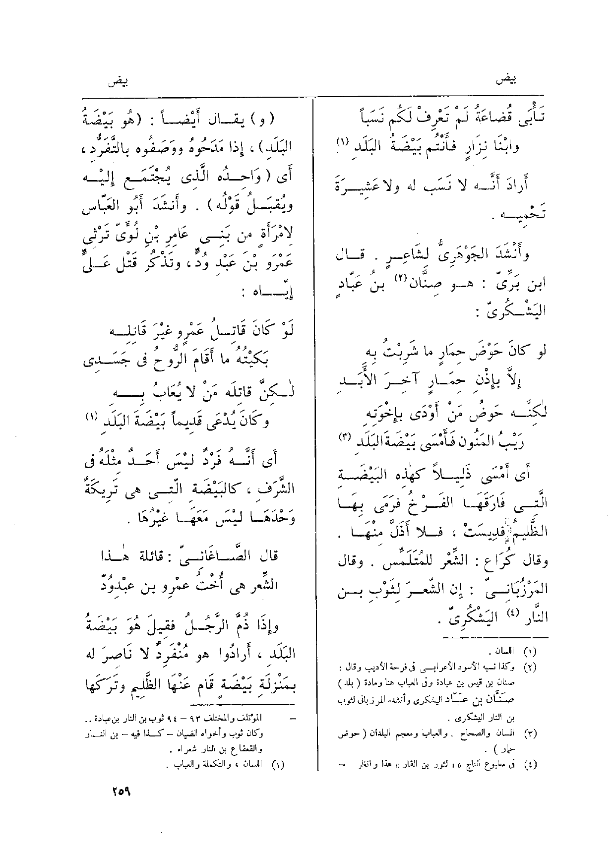 أَي أَمْسَى ذَلِيلاً كهذِه البَيْضَةِ الَّتِي فَارَقَهَا الفَرْخُ فرَمَى بِهَا الظَّلِيمُ فدِيسَتْ، فَلَا أَذَلَّ مِنْهَا. وَقَالَ كُرَاع: الشِّعْر للمُتَلَمِّس. وَقَالَ المَرْزُبَانِيّ: إِن الشّعرَ لِثَوْبِ بن النَّار اليَشْكُرِيّ. يُقَال أَيْضاً: هُو بَيْضَةُ البَلَدِن إِذا مَدَحُوهُ ووَصَفُوه بالتَّفَرُّدِ، أَي وَاحِدُه الَّذِي يُجْتَمَع إِليْه ويُقبَلُ قَوْلُه. وأَنشَدَ أَبُو العَبّاس لامْرَأَةٍ من بَنِي عَامِرِ بْنِ لُؤَيّ تَرْثِي عَمْرَو بْنَ عَبْدِ وُدٍّ، وتَذْكُر قَتْل عَليٍّ إِيّاه: