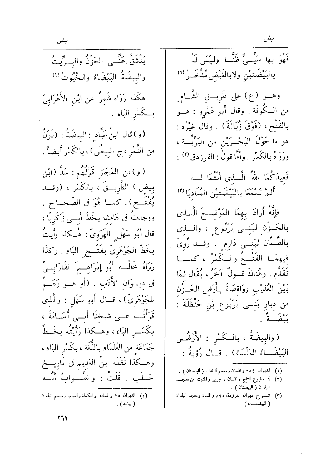 فإِنَّهُ أَرادَ بِهِمَا المَوْضِعَ الَّذِي بالحَزْنِ لبَنِي يَرْبُوعٍ، والذِي بالصَّمَّان لبَنِي دَارِمٍ. وَقد رُوِيَ فِيهِمَا الفَتْحُ والكَسْرُ، كَمَا تَقَدَّم. وهُناكَ قولٌ آَخَرُ، يُقَال لِمَا بَيْنَ العُذيْبِ ووَاقِصَةَ بأَرْضِ الحَزْنِ من دِيَارِ بَنِي يَرْبُوعِ بْنِ حَنْظَلَةَ: بَيْضَةٌ. والبِيضَةُ، بالكَسْرِ: الأَرْضُ} البَيْضَاءُ المَلْسَاءُ. قَالَ رُؤبةُ: يَنْشَقُّ عَنِّي الحَزْنُ والبِرِّيتُ والبِيضَةُ البَيْضَاءُ والخُبُوتُ هكَذا رَوَاه شَمِرٌ عَن ابْنِ الأَعْرَابِيّ بكَسْرِ البَاءِ قَالَ ابنُ عَبَّادٍ: {البِيضَةُ: لَوْنٌ من التَّمْرِ، ج} البِيضُ، بالكَسْر أَيضاً. من المَجَازِ قَوْلُهُم: سَدَّ ابْن! بِيضٍ الطَّرِيقَ، بالكَسْر، وَقد يُفْتَح، كَمَا) هُوَ فِي الصّحاح. ووجدتُ فِي هَامِشِه بخَطّ أَبِي زَكَرِيّا، قَالَ أَبُو سَهْلٍ الهَرَوِيّ: هَكَذَا رأَيتُ بخَطّ الجَوْهَرِيّ بفَتْحِ البَاءِ. وكذَا رَوَاهُ خَالُه أَبُو إِبْرَاهِيمَ الفَارَابِيّ فِي دِيوَانِ الأَدَبِ. أَو هُوَ وَهَمٌ للجَوْهَرِيّ، قَالَ أَبو سَهْلٍ: والَّذِي قَرَأْتُه على شيْخِنَا أَبِي أُسَامَةَ، بكَسْرِ البَاءِ، وَهَكَذَا رَأَيْتهُ بخَطِّ جَمَاعَةٍ من العُلَمَاءِ باللُّغَة، بكَسْرِ البَاءِ، وَهَكَذَا نَقَلَه ابنُ العَدِيم فِي تَارِيخ حَلَب. قُلْتُ: والصَّوابُ أَنَّه