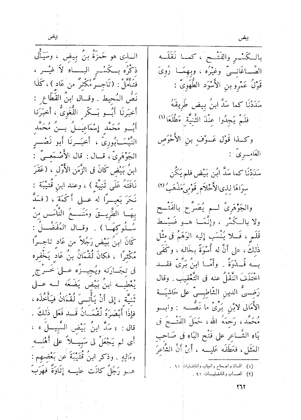 وَقَالَ رَضِيُّ الدينِ الشَّاطِبِيّ على حَاشِيَة الأَمَالي لابْنِ بَرِّيّ مَا نَصُّه: وأَبو مُحَمَّد، رَحِمَهُ الله، حَمَلَ الفَتْحَ فِي بَاءِ الشَّاعِر على فَتْح البَاءِ فِي صَاحِبِ المَثَل، فعَطَفَه عَليه، أَيْ أَنَّ الشَّاعِرَ الذِي هُوَ حَمزَةُ بنُ بِيضٍ، وسَيَأْتي ذِكْرُه بكَسْرِ البَاءِ لاَ غيْر، فتَأَمَّلْ: تَاجِرٌ مُكْثِرٌ من عَادٍ، كَذَا نَصُّ المُحِيط. وَقَالَ ابنُ القَطَّاعِ: أَخبَرنَا أَبُو بَكْرٍ اللُّغَوِيُّ، أَخبَرَنا أَبُو مُحَمَّدٍ إِسْمَاعِيلُ بنُ مُحَمَّدٍ النَّيْسَابُورِيّ، أَخبَرنَا أَبو نَصْرٍ الجَوْهَرِيّ، قَالَ: قَالَ الأَصْمَعِيّ: ابنُ بَيْضٍ كَانَ فِي الزَّمَن الأَوّلِ، عَقَرَ نَاقَتَهُ عَلَى ثَنِيَّةٍ، وَعند ابنِ قُتيْبَة: نَحَرَ بَعِيراً لَهُ على أَكَمَةٍ، فسَدَّ بِهَا الطَّرِيقَ ومَنَعَ النَّاسَ مِنْ سُلُوكِهَا. وَقَالَ المُفَضَّلُ: كَانَ ابنُ بَيْض رَجُلاً من عَادٍ تاجِراً مُكْثِراً، فكانَ لُقْمَانُ بنُ عَادٍ يَخْفِره فِي تِجَارَته ويُجِيزُه على خَرْجٍ يُعْطِيه ابنُ بَيْضِ يَضَعُه لَهُ على ثَنِيَّةٍ، إِلى أَن يَأْتِيَ لُقْمَانُ فيَأْخُذَه، فإِذَا أَبْصَرَهُ لُقْمَانُ قَد فَعَل ذلِكَ. قَالَ: سَدَّ ابنُ بَيْضٍ السَّبِيلَ، أَي لم يَجْعَلْ لي سَبِيلاً على أَهْلِهِ ومَالِهِ. وَذكر ابنُ قُتَيْبَةَ عَن بَعْضِهِم: هُوَ رَجُلٌ كانَت عَلَيْهِ إِتَاوَةٌ فهَرَبَ