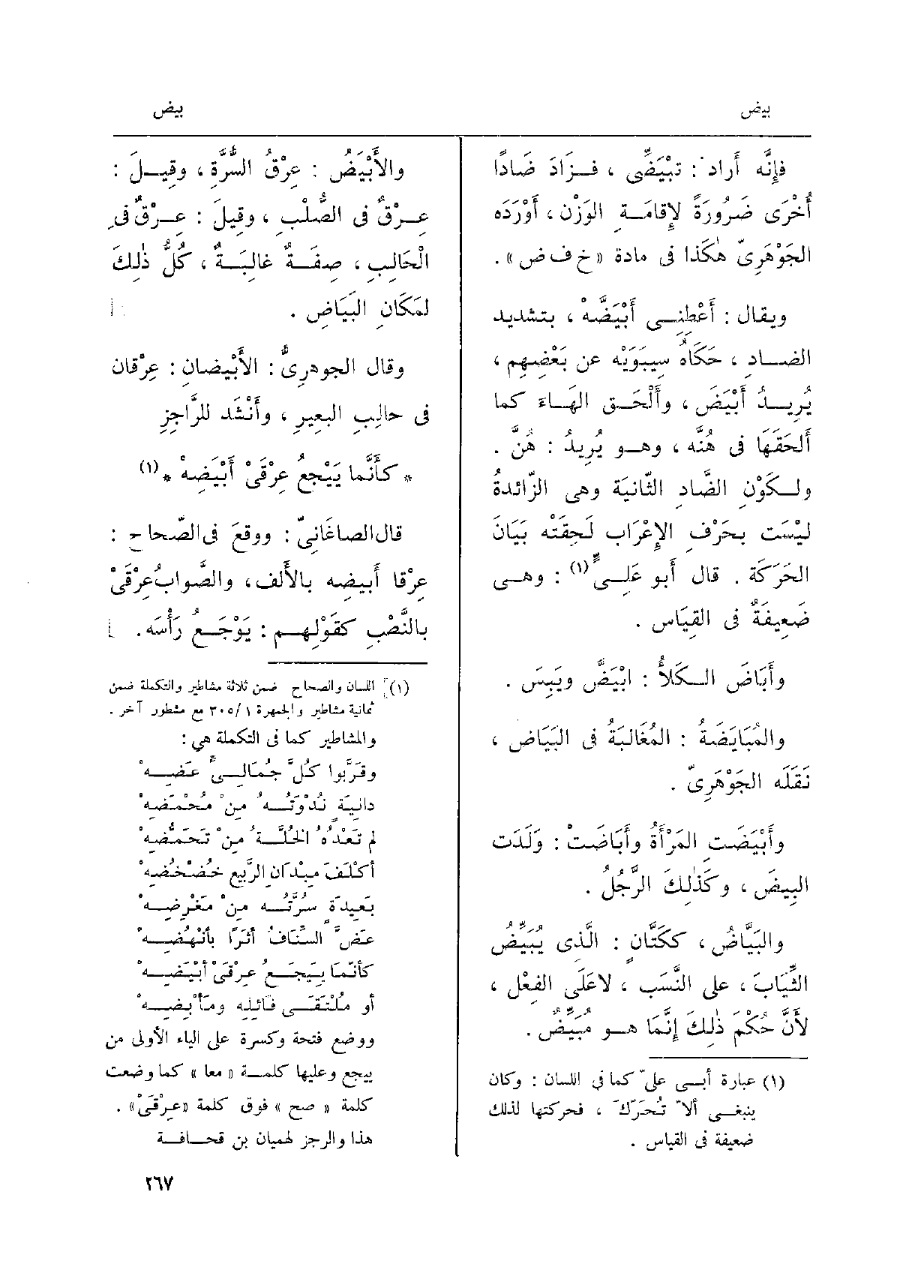 فإِنَّه أَراد: {- تَبْيَضِّي، فزَادَ ضَاداً أُخْرَى ضَرُورَةً لإِقامَةِ الوَزْن، أَوْرَدَه الجَوْهَرِيّ هكَذا فِي مَادَّة خفض. وَيُقَال: أَعْطِنِي} أَبْيَضَّهْ، بتَشْديد الضادِ، حَكَاهُ سِيبَوَيْه عَن بَعْضِهِم، يُرِيدُ أَبْيَضَ، وأَلْحَق الهَاءَ كَمَا أَلْحَقَهَا فِي هُنَّه، وَهُوَ يُرِيدُ: هُنَّ. ولكَوْنِ الضَّادِ الثّانِيَة وَهِي الزّائدةُ ليْسَت بحَرْفِ الإِعْرَاب لَحِقَتْه بَيَانَ الحَرَكَة. قَالَ أَبو عَلِيٍّ: وَهِي ضَعِيفَةٌ فِي القِيَاس. {وأَبَاضَ الكَلأُ: ابْيَضَّ ويَبِسَ.} والمُبَايَضَةُ: المُغَالبَةُ فِي البَيَاض، نَقَلَه الجَوْهَرِيّ. {وأَبْيَضَتِ المَرْأَةُ} وأَبَاضَتْ: وَلَدَت البِيضَ، وكَذلِكَ الرَّجُلُ. {والبَيَّاضُ، ككَتَّانٍ: الَّذِي} يُبَيِّضُ الثِّيَابَ، على النَّسَب، لَا عَلَى الفِعَل، لأَنَّ حُكْمَ ذلِكَ إِنَّمَا هُوَ {مُبَيِّضٌ.} والأَبْيَضُ: عِرْقُ السُّرَّةِ، وقِيلَ: عِرْقٌ فِي الصُّلْبِ، وقِيلَ: عِرْقٌ فِي الْحَالِبِ، صِفَةٌ غالِبَةٌ، كُلُّ ذلِكَ لمَكَانِ البَيَاضِ. وَقَالَ الجَوْهِرِيُّ: {الأَبْيضانِ: عِرْقان فِي حالِبِ البعِيرِ، وأَنْشَد للرَّاجِزِ كأَنَّما يَيْجعُ عِرْقَيْ} أَبْيَضِهْ قَالَ الصاغَانِيّ: ووقعَ فِي الصّحاح: عِرْقا أَبيضِه بالأَلف، والصَّوابُ عِرْقَيْ بالنَّصْبِ كقَوْلِهم: يُوَجَعُ رَأْسَه.