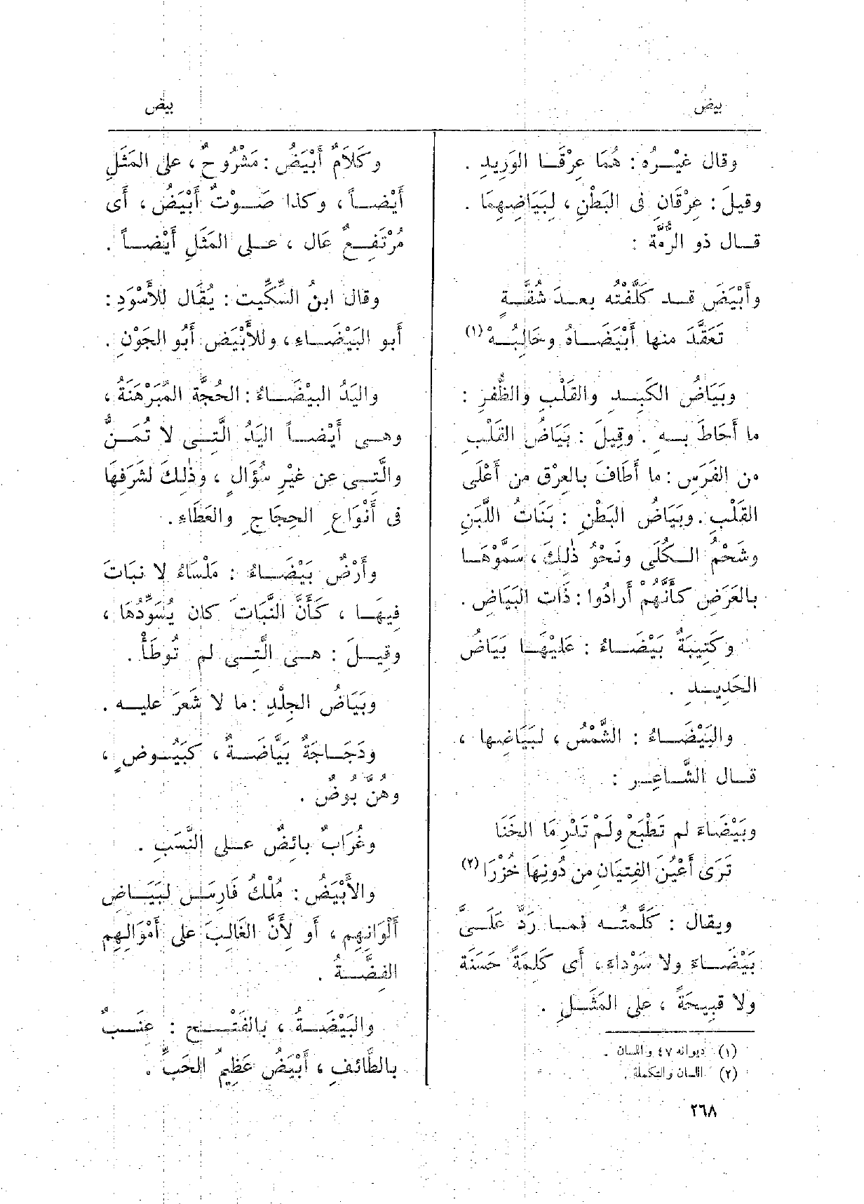 وَقَالَ ابنُ السِّكِّيت: يُقَال للأَسْوَدِ: أَبو البَيْضَاءِ، {وللأَبْيَض أَبُو الجَوْنِ. واليَدُ} البيْضَاءِ، الحُجَّة المُبَرْهَنَةُ، وَهِي أَيْضاً اليَدُ الَّتِي لَا تُمَنُّ والَّتِي عَن غيْرِ سُؤَالٍ، وذلِكَ لشَرَفِهَا فِي أَنْوَاعِ الحِجَاجِ والعَطَاءِ. وأَرْضٌ {بَيْضَاءُ: مَلْسَاءُ لَا نبَاتَ فِيهَا، كَأَنَّ النَّبَاتَ كَانَ يُسَوِّدُهَا، وقِيلَ: هِيَ الَّتِي لم) تُوطَأْ.} وبَيَاضُ الجِلْدِ: مَا لَا شَعرَ عَلَيْهِ. ودَجَاجَةٌ {بَيَّاضَةٌ، كبَيُوضٍ، وهُنَّ} بُوضٌ. وغُرَابٌ بائِضٌ على النَّسَبِ، {والأَبْيَضُ: مُلْكُ فَارِسَ لبَيَاضِ أَلْوانِهِم، أَو لأَنَّ الغَالِبَ على أَمْوَالِهِم الفِضَّةُ.