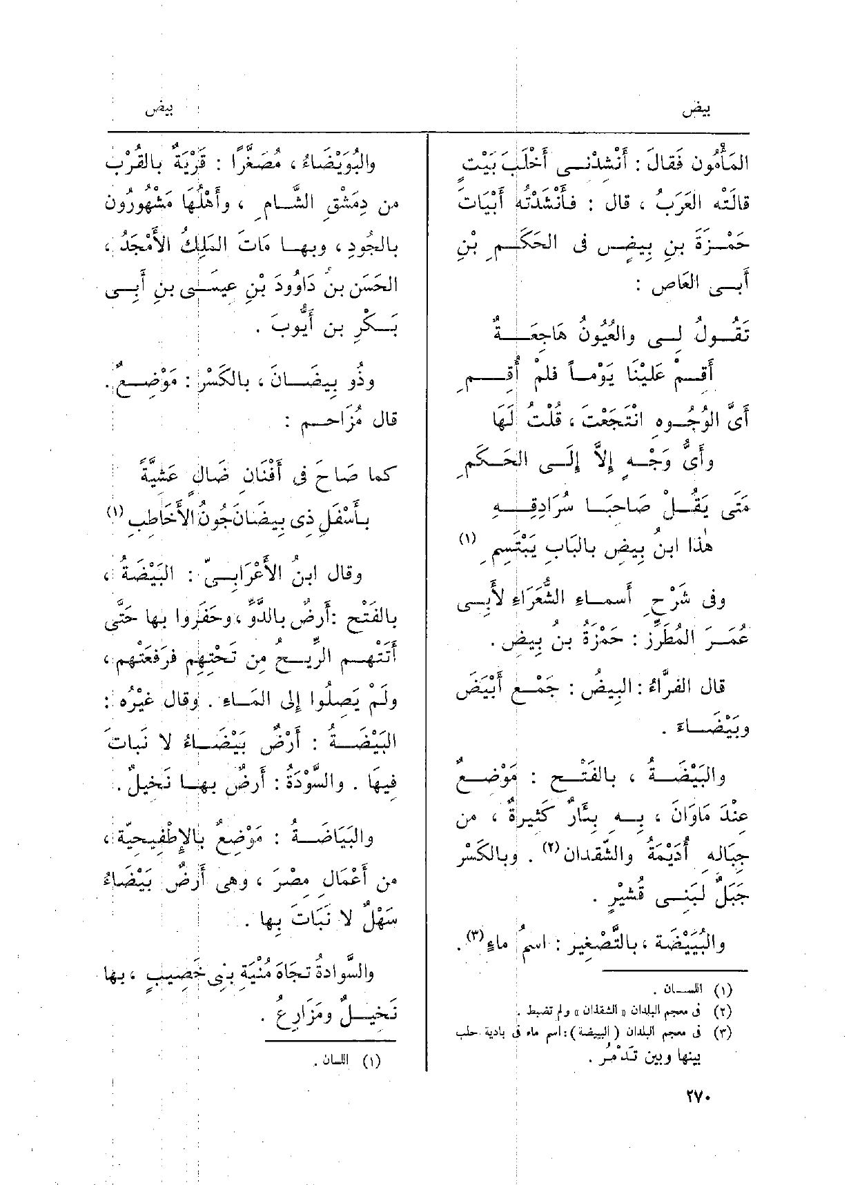 مَتَى يَقُلْ صَاحِبَا سُرَادِقِهِهذا ابنُ بِيضِ بالبَابِ يَبْتَسِمِ وَفِي شَرْحِ أَسماءِ الشُّعَرَاءِ لأَبِي عُمَرَ المُطَرِّز: حَمْزَةُ بنُ بِيضِ. قَالَ الفَرَّاءُ: البِيضُ: جَمْع أَبْيَضَ وبَيْضَاءَ. والبَيْضَةُ، بالفَتْح: مَوْضعٌ عِنْدَ مَاوَانَ، بِهِ بِئَارٌ كَثيرةٌ، من جِبَالهِ أُدَيْمَةُ والشّقدان. وبالكَسْر جَبَلٌ لبَنِي قُشيْرٍ: {والبُيَيْضَة، بالتَّصْغِير: اسمُ ماءٍ.} والبُوَيْضَاءُ، مُصَغَّراً: قَرْيَةٌ بالقُرْب من دِمَشْقِ الشَّامِ، وأَهْلُهَا مَشْهُورُون بالجُودِ، وَبهَا مَاتَ المَلِكُ الأَمْجَدُ، الحَسَن بنُ)