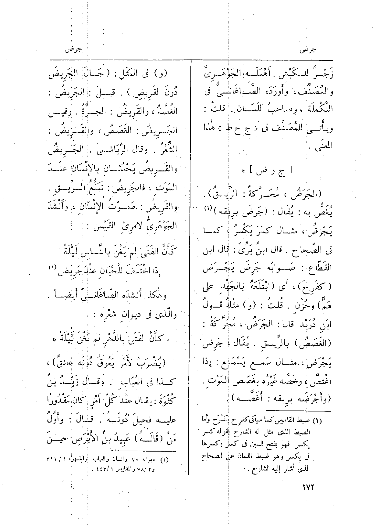 (كَأَنَّ الفَتَى لم يَغْنَ بالنَّاسِ لَيْلَةً ... إِذا اخْتَلَفَ اللَّحْيَانِ عِنْدَ جَرِيض)