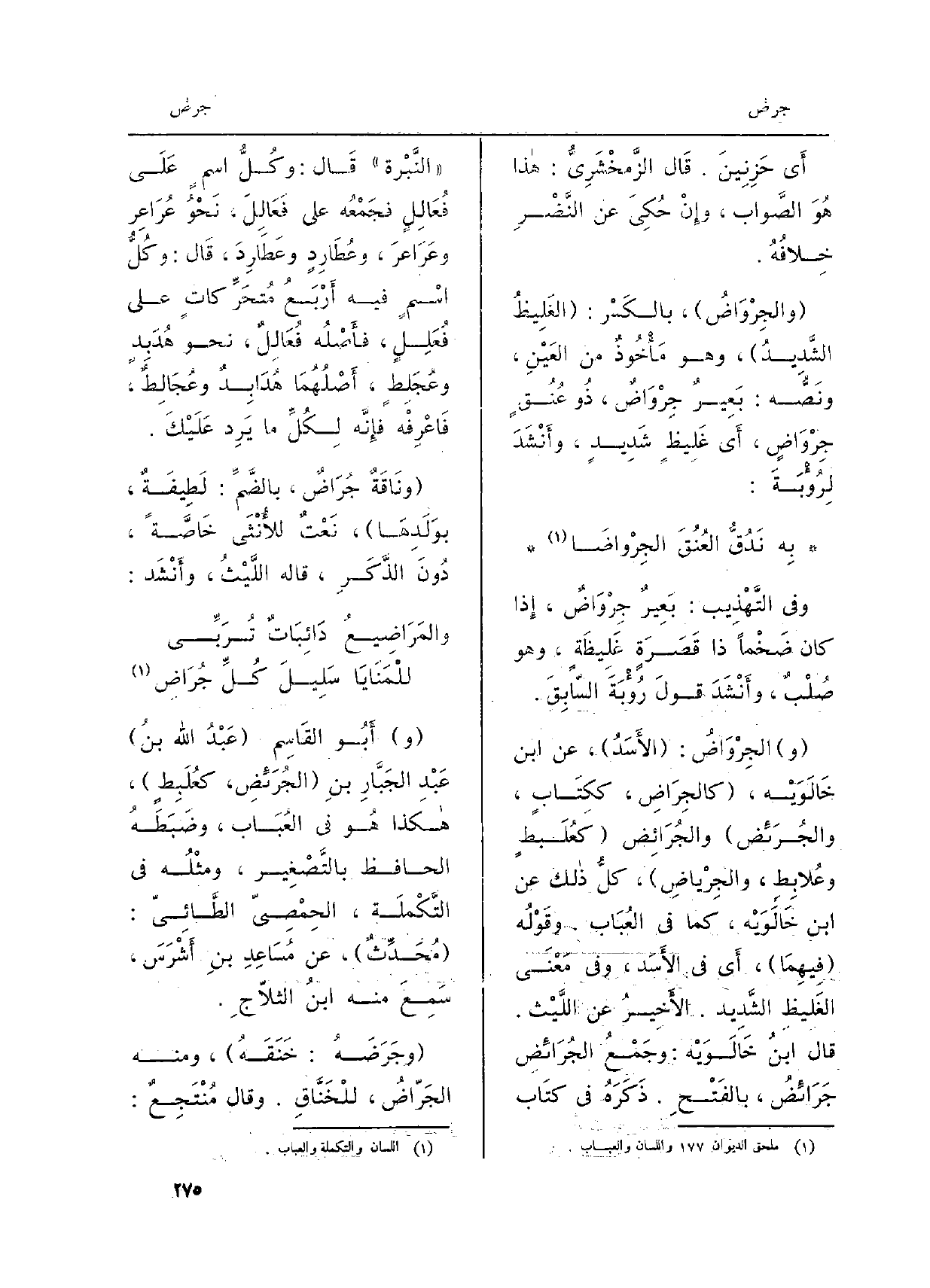 أَي حَزِنِينَ. قَال الزَّمخْشَرِيُّ: هَذَا هُوَ الصَّواب، وإِنْ حُكِيَ عَن النَّضْرِ خِلافُهُ. والجِرْوَاضُ، بالكَسْر: الغَلِيظُ الشَّدِيدُ، وَهُوَ مَأْخُوذٌ من العَيْنِ، ونَصُّه: بَعِيرٌ جِرْوَاضٌ، ذُو عُنُقٍ جِرْوَاضٍ، أَي غَلِيظٍ شَدِيدٍ، وأَنْشَدَ لِرُؤْبَةَ: بِهِ نَدُقُّ العُنُقَ الجِرْواضَا وَفِي التَّهْذِيب: بَعِيرٌ جِرْوَاضٌ، إِذا كَانَ ضَخْماً ذَا قَصَرَةٍ غَلِيظَةٍ، وَهُوَ صُلْبٌ، وأَنْشَدَ قولَ رُؤْبَةَ السّابِقَ. الجِرْوَاضُ: الأَسَدُ، عَن ابْن خَالَوَيْه، كالجِرَاضِ، ككِتَابٍ، والجُرَئِض والجُرَائِض كعُلَبطٍ وعُلابِطِ، والجِرْياضِ، كلُّ ذَلِك عَن ابْن خَالَوَيْه، كَمَا فِي العُبَاب. وقَوْلُه فِيهِمَا، أَي فِي الأَسَد، وَفِي مَعْنَى الغَلِيظِ الشَّدِيد. الأَخِيرُ عَن اللَّيْث. قَالَ ابنُ خَالَوَيْه: وجَمْعُ الجُرَائِضِ جَرَائِضُ، بالفَتْحِ. ذَكَرَهُ فِي كِتَاب النَّبْرة قَال: وكُلُّ اسمٍ عَلَى فُعَالِلٍ فجَمْعُه على فَعَالِلَ، نَحْوُ عُرَاعِر وعَرَاعِرَ، وعُطَارِدٍ وعَطَارِدَ، قَال: وكُلُّ اسْمٍ فِيهِ أَرْبَعُ مُتحَرِّكاتٍ على فُعَلِلٍ، فأَصْلُه فُعَالِلٌ، نَحْو هُدَبِدٍ وعُجَلِطٍ، أَصْلُهُمَا هُدَابِدٌ وعُجَالِطٌ، فاعْرِفُه فإِنَّه لِكُلِّ مَا يَرِد عَلَيْكَ. ونَاقَةٌ جُرَاضٌ، بالضَّمِّ: لَطِيفَةٌ، بوَلَدِهَا، نَعْتٌ للأُنْثَى خَاصَّةً، دونَ الذَّكَرِ، قَالَه اللَّيْثُ، وأَنْشَدَ: