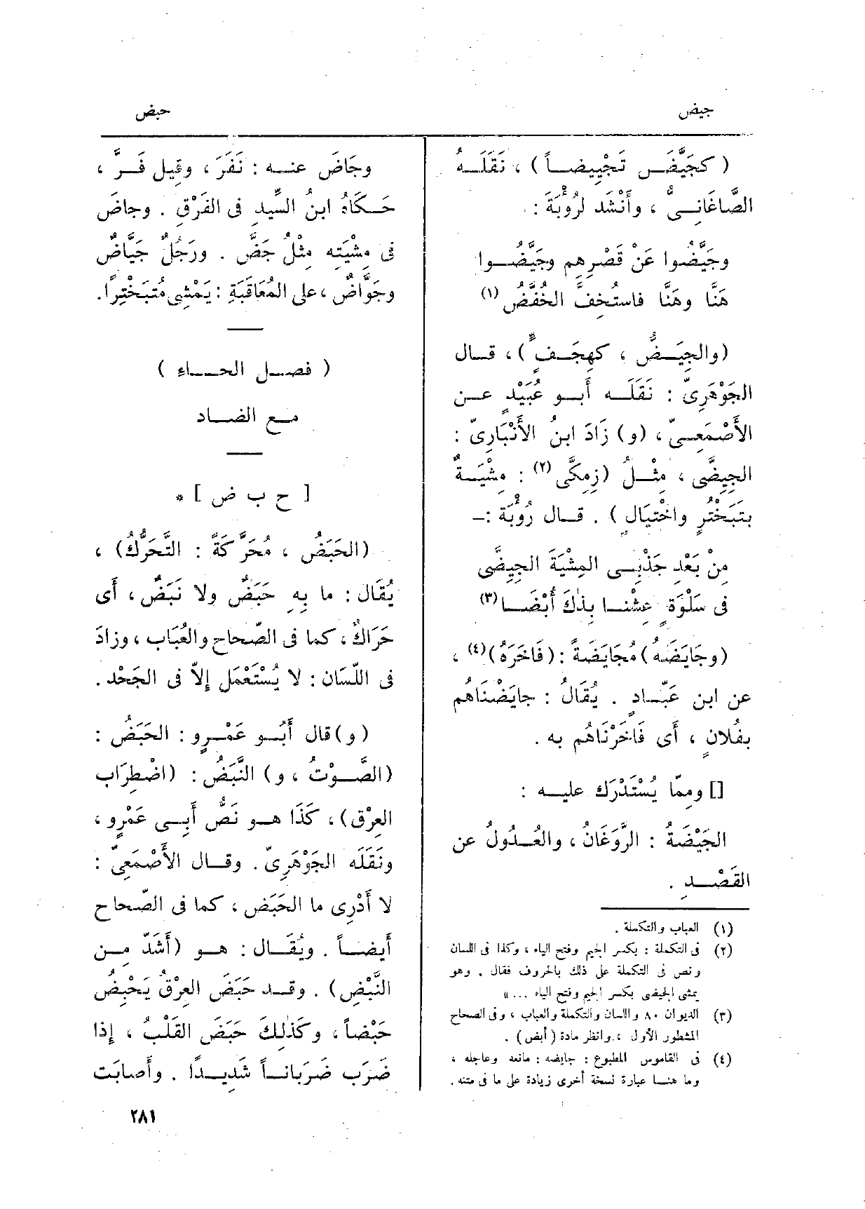 ُ} والجِيَضُّ، كهِجَفٍّ، قَالَ الجَوْهَرِيّ: نَقَلَه أَبو عُبَيْدٍ عَن الأَصْمَعِيّ، زَادَ ابنُ الأَنْبَارِيّ: {الجِيِضّيَ، مِثْلُ زِمِكَّى: مِشْيَةٌ بتَبَخْتُرٍ واخْتِيَالٍ. قَالَ رُؤْبَة: مِنْ بَعْدِ جَذْبِي المِشْيَةَ الجِيِضَّى فِي سَلْوَةِ عِشْنَا بِذكَ أُرْضَا} وجَايَضَهُ {مُجَايَضَةً: فَاخَرَهُ، عَن ابْن عَبّادٍ. يُقَالُ:} جايَضْنَاهُم بفُلانٍ، أَي فَاخَرْنَاهُم بِهِ. وممّا يُسْتَدْرَكُ عَلَيْهِ: {الجَيْضَةُ: الرَّوْغَانُ، والعُدُولُ عَن القَصْدِ. وجَاضَ عَنهُ: نَقَرَ، وقِيل فَرَّ، حَكَاهُ ابنُ السِّيدِ فِي الفَرْقِ.} وجاضَ فِي مِشْيَتِه مِثْلُ جَضَّ. ورَجُلٌ جَيَّاضٌ وجَوَّاضٌ، على المُعَاقَبَةِ: يَمْشِي مُتبَخْتِراً.