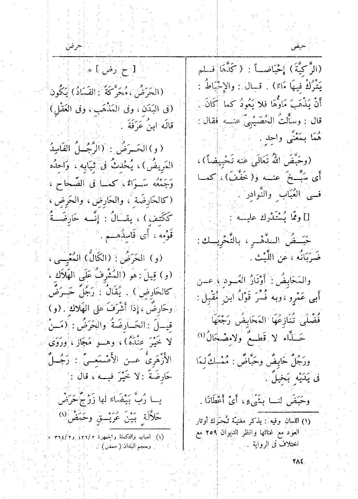 الحَرَضُ: الرَّجُلُ الفَاسِدُ المَرِيضُ، يُحْدِثُ فِي ثِيَابِه، وَاحِدُه وَجَمْعُه سَوَاءٌ، كَمَا فِي الصّحاح، كالحَارِضَةِ، والحَارِضِ، والحَرِضِ، كَكَتِفٍ، يقَالُ: إِنَّه حَارِضَةُ قَوْمه، أَي فَاسِدُهم. الحَرَضُ: الكَالُّ المُعْيِي، قِيلَ: هُوَ المُشْرِفُ عَلَى الهَلاَكِ، كالحَارِض. يُقَالُ: رَجُلٌ حَرَضٌ وحَارِضٌ، إِذا أَشْرَفَ على الهَلاكِ. قِيلَ: الحَارِضَةُ والحَرَضُ: مَنْ لَا خَيْرَ عِنْدَه، وَهُوَ مَجَاز، ورَوَى الأَزْهَرِيُّ عَن الأَصْمَعِيّ: رَجُلٌ حَارضَةٌ: لَا خَيْرَ فِيهِ، قَالَ: يَا رُبَّ بَيْضَاءَ لَهَا زَوْجٌ حَرَضْ حَلاَّلَةٍ بَيْنَ عُرَيْقٍ وحَمَضْ