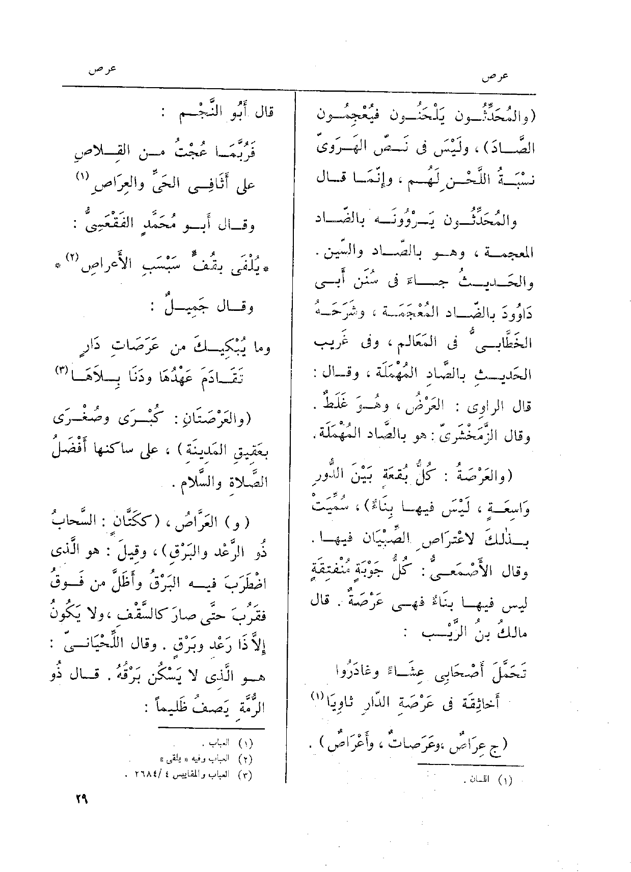 والمُحَدِّثُون يَلْحَنُون فيُعْجِمُون الصَّادَ، ولَيْسَ فِي نَصّ الهَرَويّ نسْبَةُ اللَّحْنِ لَهُم، وإِنّمَا قَالَ والمُحَدِّثُون يَرْوُونَه بالضَّاد الْمُعْجَمَة، وَهُوَ بالصّاد والسّين. والحَديثُ جاءَ فِي سُنَن أَبي دَاوُودَ بالضّاد المُعْجَمَة، وشَرَحَهُ الخَطَّابيُّ فِي المَعَالم، وَفِي غَريب الحَديثِ بالصَّادِ المُهْمَلَة، وَقَالَ: قَالَ الراوِي: العَرْضُ، وهُوَ غَلَطٌ. وَقَالَ الزَّمَخْشَريّ: هُوَ بالصَّاد المُهْمَلَة. والعَرْصَةُ: كُلُّ بُقعَةٍ بَيْنَ الدُّورِ وَاسِعَةٍ، لَيْسَ فِيهَا بِنَاءٌ، سُمِّيَتْ بذلكَ لاعْترَاضِ الصِّبْيَان فِيهَا. وَقَالَ الأَصْمَعيُّ: كُلُّ جَوْبَةٍ مُنْفتِقَةٍ لَيْسَ فِيهَا بنَاءٌ فَهِيَ عَرْصَةٌ. قَالَ مالكُ بنُ الرَّيْب: