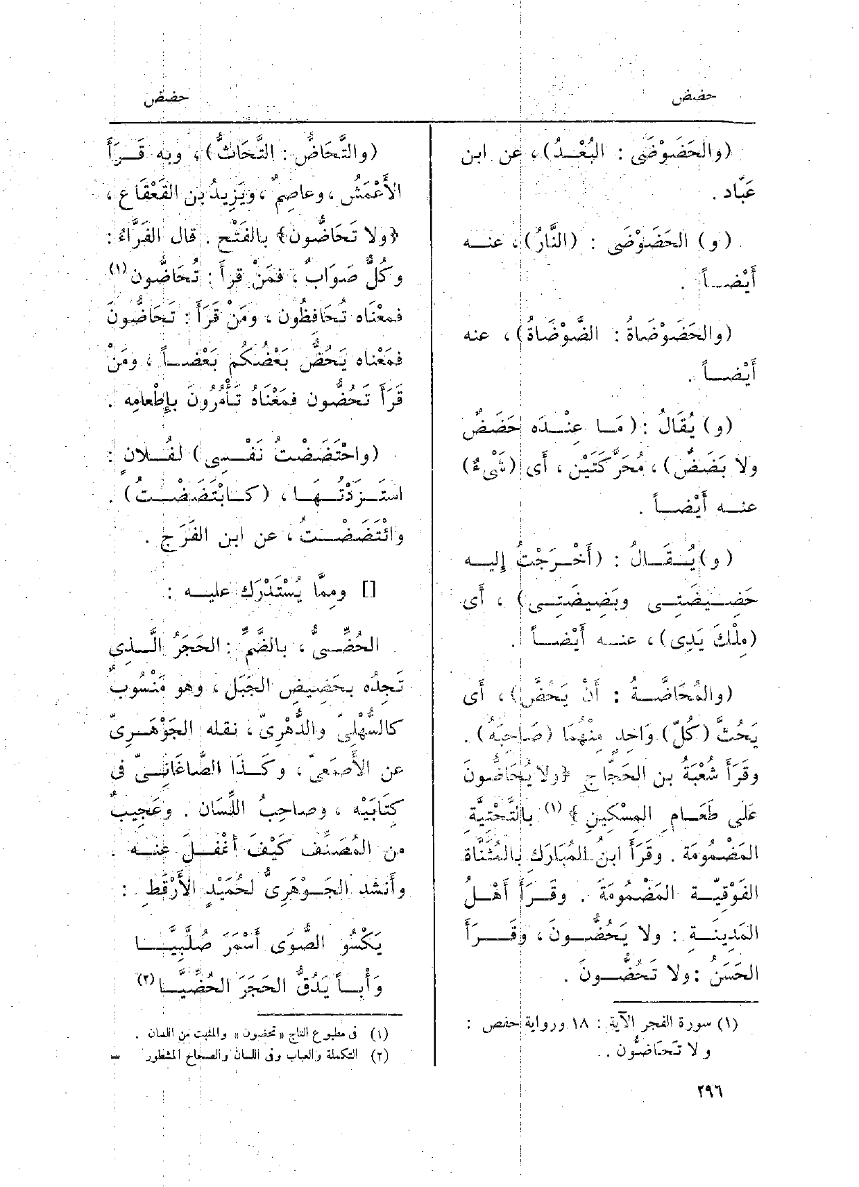 {والحَضَوْضَى: البُعْدُ، عَن ابْن عَبّاد. و} الحَضَوْضَى: النَّارُ، عَنهُ أَيِضاً. {والحَضَوْضَاةُ: الضَّوْضَاةُ، عَنهُ أَيْضاً. يُقَالُ: مَا عِنْدَه} حَضَضٌ وَلَا بَضَضٌ، مُحَرَّكَتَيْن، أَي شَيءٌْ عَنهُ أَيْضاً. يُقَالُ: أَخْرَجَتُ إِليه {- حَضِيضَتِي وبَضِيضَتِي، أَي مِلْكَ يَدِي، عَنهُ أَيْضاً.} والمُحَاضَّةُ: أَنْ {يَحْضَّ، أَي يَحُثَّ كُلّ وَاحِدٍ مِنْهُمَا صَاحِبَهُ. وقَرَأَ شُعْبَةُ بن الحَجَّاجِ وَلَا} يُحَاضُّونَ عَلى طَعَامِ المِسْكِينِ بالتَّحْتِيَّةِ المَضْمُومَة. وقَرَأَ ابنُ المُبَارَكِ بالمُثَنَّاة الفَوْفِيّة المَضْمُومَةَ. وقَرَأَ أَهْلُ المَدِينَةِ: وَلَا {يَحُضُّونَ، وقَرَأَ الحَسَنُ: وَلَا} تَحُضُّونَ. {والتَّحَاضُّ: التَّحَاثُّ، وَبِه قَرَأَ الأَعْمَشُ، وعاصِمٌ، ويَزِيدُ بن القَعْقَاع، وَلَا} تَحَاضُّون بالفَتْح. قَالَ الفَرَّاءُ: وكُلٌّ صَوَابٌ، فمَنْ قرأَ: {تُحَاضُّون فمعْنَاه تُحَافِظُون، ومَنْ قرأَ: تَحَاضُّونَ فمَعْناه} يَحُضُّ بَعْضُكُم بَعْضاً، ومَنْ قَرَأَ {تَحُضُّون فمَعْنَاهُ تَأْمُرُونَ بإِطْعامِه.} واحْتَضَضْتُ نَفْسِي لفُلانٍ: استَزَدْتُهَا، كابْتَضَضْتُ. وائْتَضَضْتُ، عَن ابْن الفَرَج. ومِمَّا يُسْتَدْرَك عَلَيْهِ: {- الحُضِّيُّ، بالضَّمِّ: الحَجَرُ الَّذِي تَجِدُه} بحَضِيضِ الجَبَل، وَهُوَ مَنْسُوبٌ كالسُّهْلِيّ والدُّهْرِيّ، نَقله الجَوْهَرِيّ عَن الأَصْمَعِيّ، وكَذَا الصَّاغَانِيّ فِي كِتَابَيْه، وصاحِبُ اللِّسَان. وعَجِيبٌ من المُصَنِّف كَيْفَ أَغْفلَ عَنهُ. وأَنشد الجَوْهَرِيُّ لحُمَيْدٍ الأَرْقَطِ: يَكْسُو الصُّوَى أَسْمَرَ صُلَّبِيَّا وَأْباً يَدُقُّ الحَجَرَ! الحُضِّيَّا