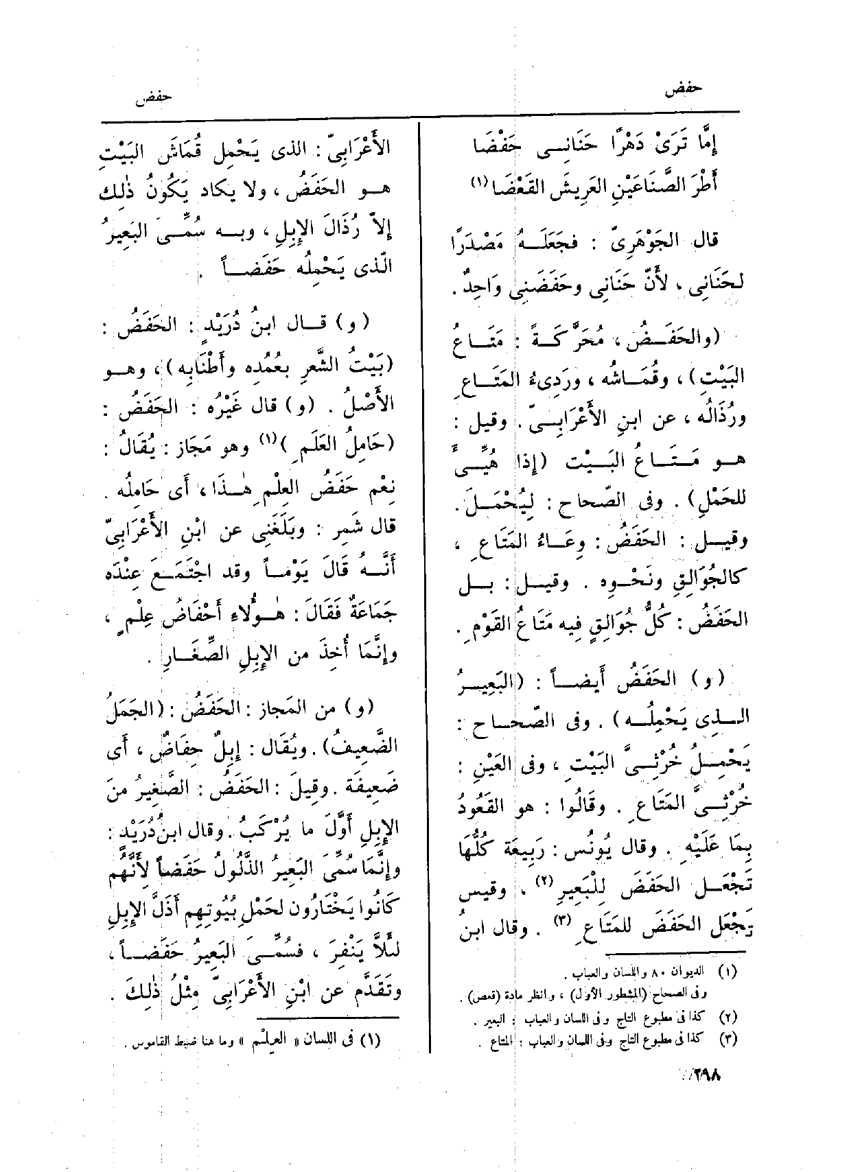 إِمَّا تَرَى دَهْراً حَنَانِي حَفْضَا أَطْرَ الصَّنَاعَين العَرِيشَ القَعْضَا قَالَ الجَوْهَرِيّ: فجَعَلَهُ مَصْدَراً لحَنَانِي، لأَنَّ حَنَانِي وحَفَضَنِي وَاحِدٌ. والحَفَضُ، مُحَرَّكَةً: مَتَاعُ البَيْتِ، وقُمَاشُه، ورَديءُ المَتَاعِ ورُذَالُه، عَن ابنِ الأَعْرَابِيّ. وَقيل: هُوَ مَتَاعُ البَيْت إِذا هُيِّئَ للحَمْلِ. وَفِي الصّحاح: لِيُحْمَلَ. وَقيل: الحَفَضُ: وِعَاءُ المَتَاعِ، كالجُوَلِقِ ونَحْوِه. وَقيل: بل الحَفَضُ: كُلُّ جُوَالِقٍ فِيه مَتَاعُ القَوْمِ. الحَفَضُ أَيضاً: البَعِيرُ الذِي يَحْمِلُه. وَفِي الصّحاح: يَحْمِلُ خُرْثِيَّ البَيْتِ، وَفِي العَيْنِ: خُرْثِيَّ المَتَاعِ. وقَالُوا: هُوَ القَعُودُ بِمَا عَلَيْهِ. وَقَالَ يُونُس: رَبِيعَة كُلُّهَا تَجْعَل الحَفَضَ لِلْبَعِيرِ، وَقيس وتَجْعَل الحَفَضَ للمَتَاعِ. وَقَالَ ابنُ الأَعْرَابِيّ: الَّذِي يَحْمِل قُمَاشَ البَيْتِ هُوَ الحَفَضُ، وَلَا يَكاد يَكُونُ ذلِك إِلاّ رُذَالَ الإِبِلِ، وَبِه سُمِّيَ البَعِيرُ الّذي يَحْمِلُه حَفَضاً.