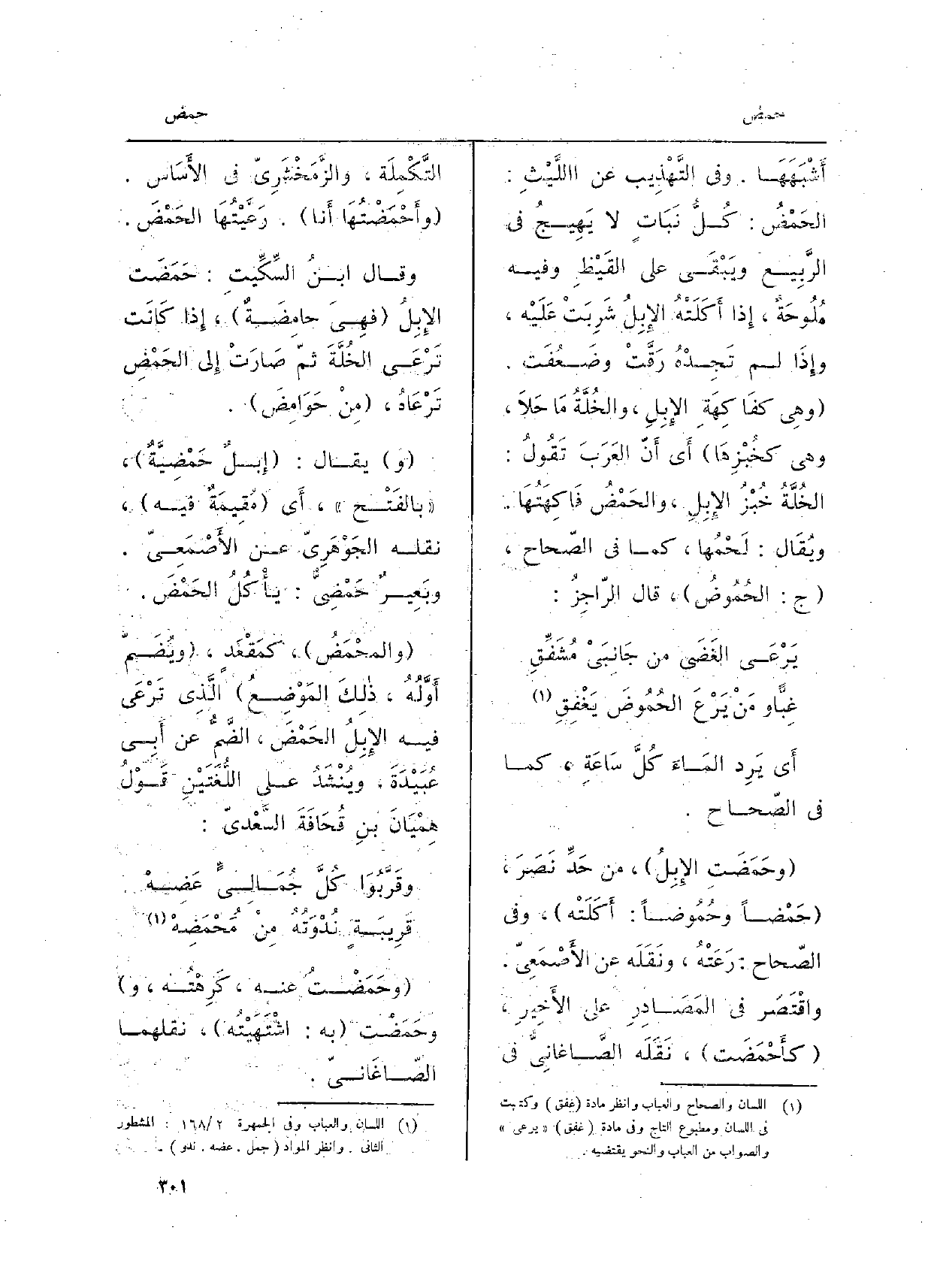أَشْبَهَهَا. وَفِي التَّهْذِيب عَن اللَّيْثِ: الحَمْضُ: كُلُّ نَبَاتٍ لَا يَهِيجُ فِي الرَّبِيع ويَبْقَى على القَيْظِ وَفِيه مُلُوحَةٌ، إِذا أَكَلَتْهُ الإِبِلُ شَرِبَتْ عَلَيْه، وإِذَا لم تَجِدْهُ رَقَّتْ وضَعُفَت. وهِي كفَاكِهَةِ الإِبِلِ، والخُلَّةُ مَا حَلاَ، وَهِي كخُبْزِهَا أَي أَنَّ العَرَبَ تَقُولُ: الخُلَّةُ خُبْزُ الإِبِلِ، والحَمْضُ فَاكِهَتُهَا. ويُقَال: لَحْمُها، كَمَا فِي الصّحاح، ج: الحُمُوضُ، قَالَ الرّاجِزُ: يَرْعَى الغَضَى من جَانِبَيْ مُشَفِّقِ غِبّاً ومَنْ يَرْعَ الحُمُوضَ يَغْفِقِ أَي يَرِد المَاءَ كُلَّ سَاعَةٍ، كَمَا فِي الصّحاح. وحَمَضَتِ الإِبِلُ، من حَدِّ نَصَرَ، حَمْضاً وحُمُوضاً: أَكَلَتْه، وَفِي الصّحاح: رَعَتْهُ، ونَقَلَه عَن الأَصْمَعِيّ. واقْتَصَر فِي المَصَادِرِ على الأَخِيرِ، كاحْمَضَت، نَقَلَه الصَّاغانِيُّ فِي التَّكْمِلَة، والزَّمَخْشَرِيّ فِي الأَسَاس. وأَحْمَضْتُهَا أَنا. رَعَّيْتُهَا الحَمْضَ. وَقَالَ ابنُ السِّكِّيتِ: حَمَضَت الإِبِلُ فهِيَ حامِضَةٌ، إِذا كَانَت تَرْعَى الخُلَّةَ ثمّ صَارَتْ إِلى الحَمْضِ تَرْعَاهُ، مِنْ حَوَامِضَ. يُقَال: إِبلٌ حَمْضِيَّةٌ، بالفَتْح، أَي مُقِيمَةٌ فِيهِ، نَقله الجَوْهَرِيّ عَن الأَصْمَعِيّ. وبَعِيرٌ حَمْضِيٌّ: يأْكُلُ الحَمْضَ. والمحْمَضُ، كمُقْعَدٍ، ويُضَمّ أَوَّلُهُ، ذلِكَ المَوْضِعُ الَّذِي تَرْعَى فِيهِ الإِبِلُ الحَمْضَ، الضَّمُّ عَن أَبِي عُبَيْدَةَ، ويُنْشَدُ على اللُّغَتَيْنِ قَوْلُ هِمْيَانَ بنِ قُحَافَةَ السَّعْديّ: وقَرِّبُوا كُلَّ جُمَالِيٍّ عَضِهْ قَرِيبَةٍ نُدْوَتُهُ مِنْ مُحْمَضِهْ وحَمَضْتُ عَنهُ، كَرِهْتُه، ووحَمَضْت بِهِ: اشْتَهَيْتُهن نقلهما الصّاغَانيّ.